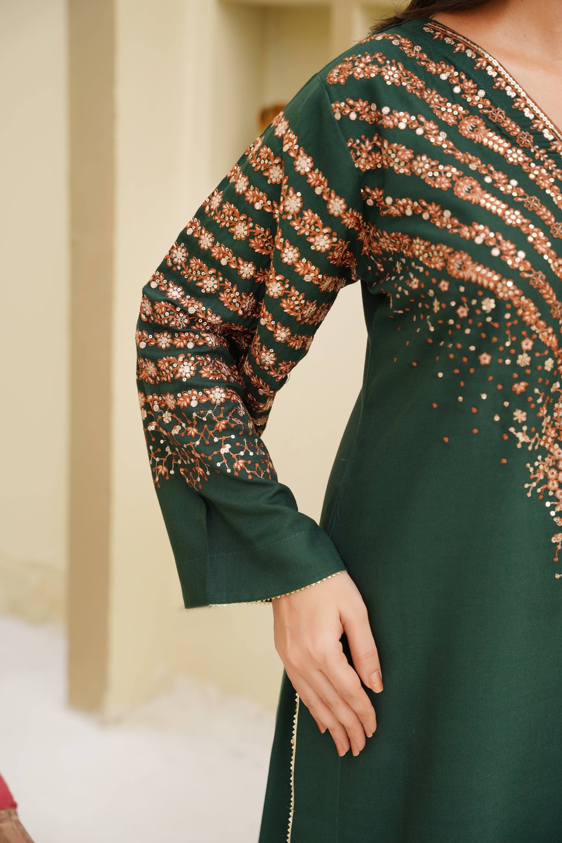 Zarmin – Green & Golden Dhanak 3Pc Suit embodies timeless elegance and festive sophistication. Crafted from premium Dhanak fabric, this stunning outfit features exquisite golden embroidery on a rich black canvas, creating a perfect blend of luxury and grace. The intricate detailing on the neckline and sleeves adds a regal charm, while the delicately embroidered Organza Dupatta enhances its ethereal beauty. Paired with matching embellished trousers, this ensemble is ideal for festive dinners, weddings, and formal gatherings — a masterpiece designed to make you shine effortlessly.