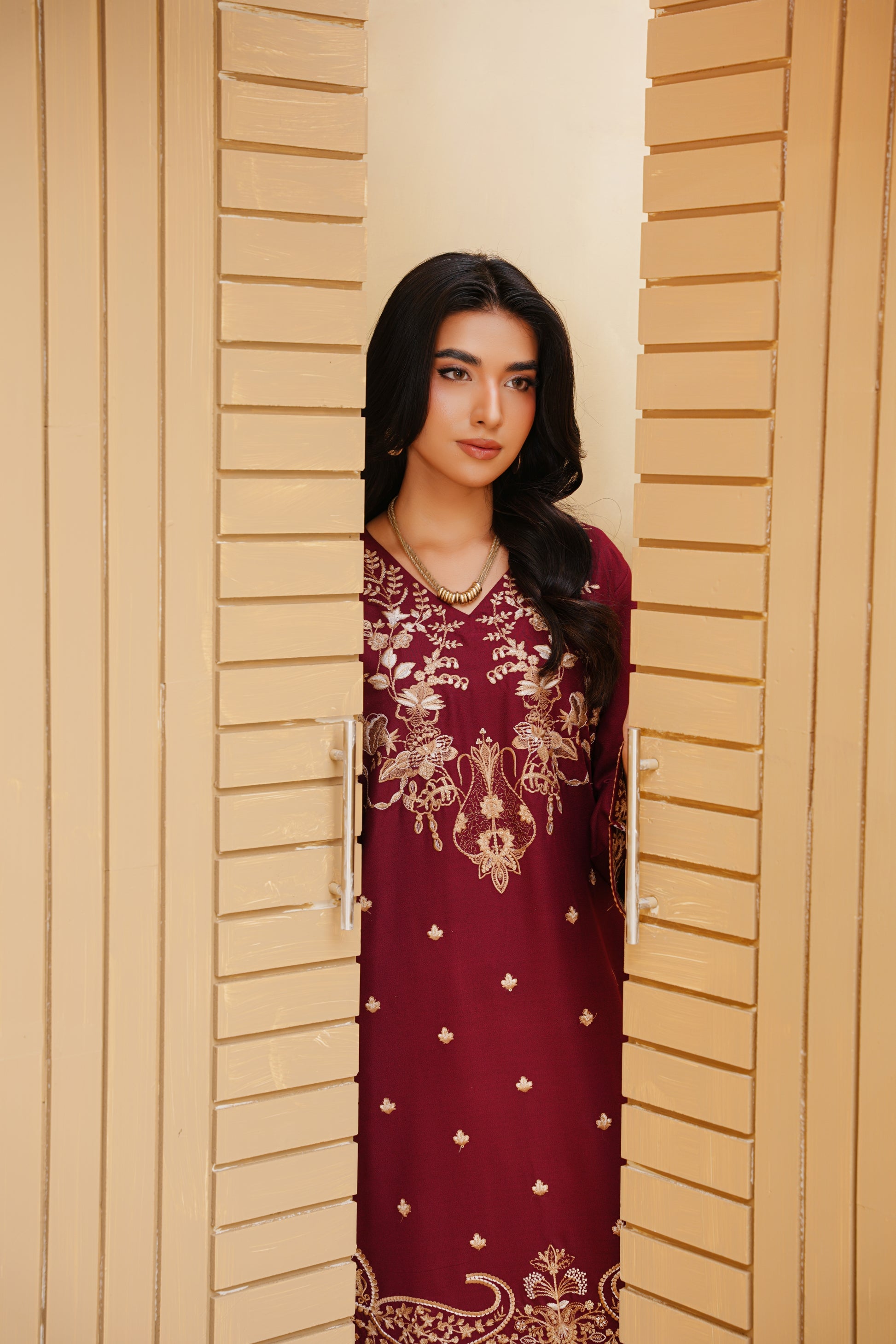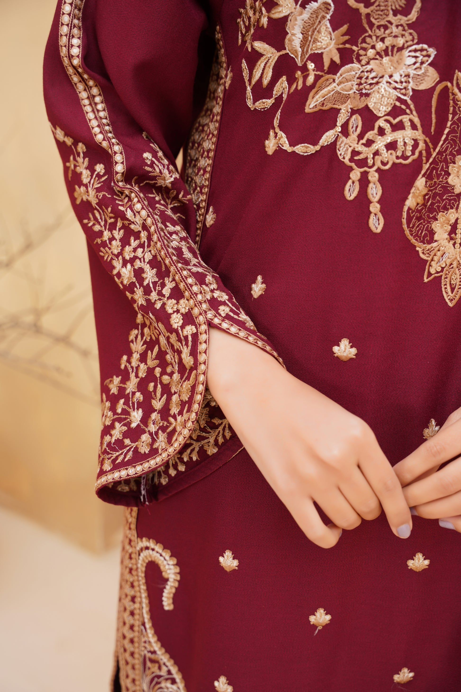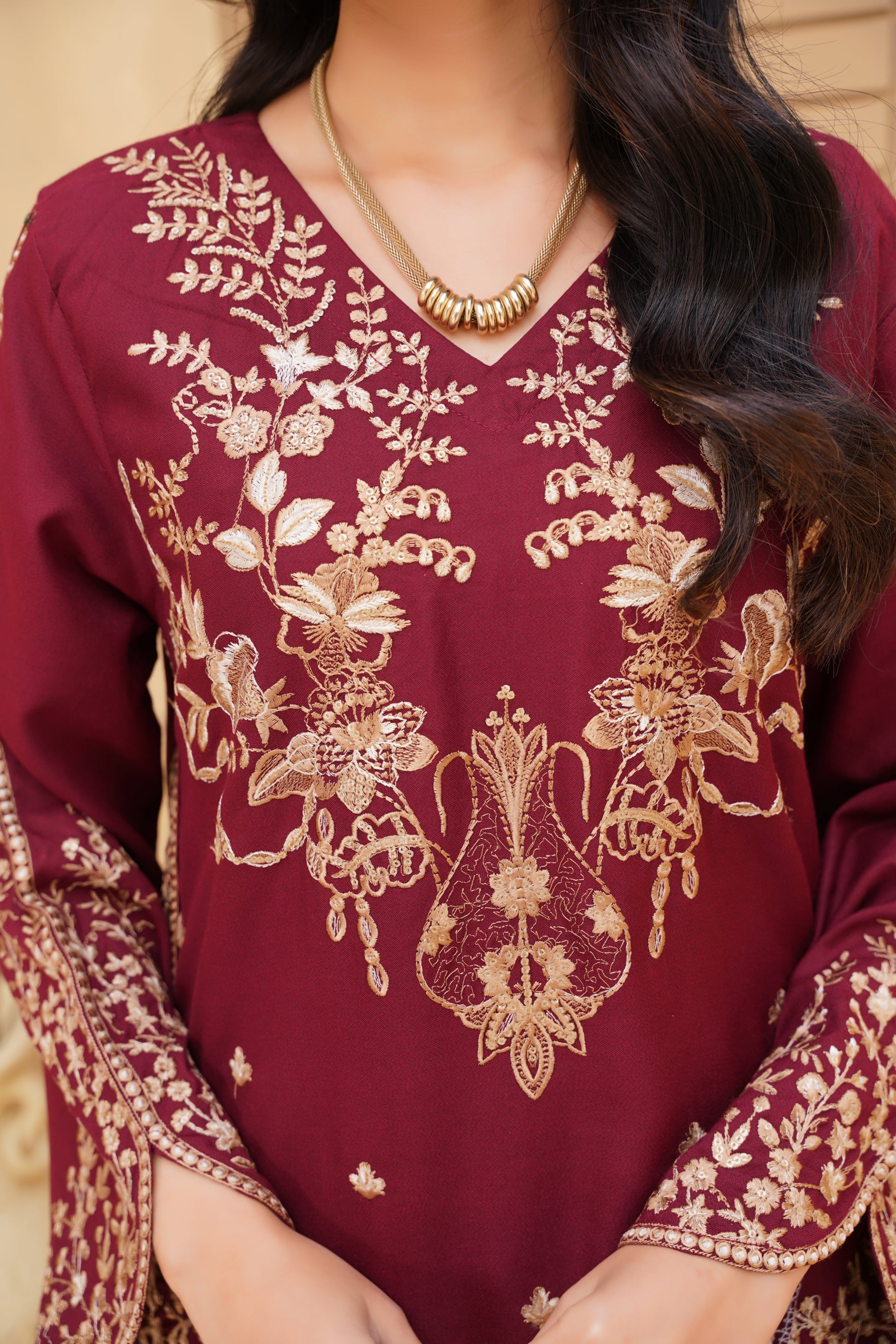 Unveil regal elegance with the brown Majesty Embroidered Dhanak Suit. This rich maroon ensemble is crafted from premium Dhanak fabric, offering both warmth and style for the winter season. The finely detailed embroidery enhances the shirt with a luxurious touch, . A perfect pick for festive occasions, family gatherings, and winter.