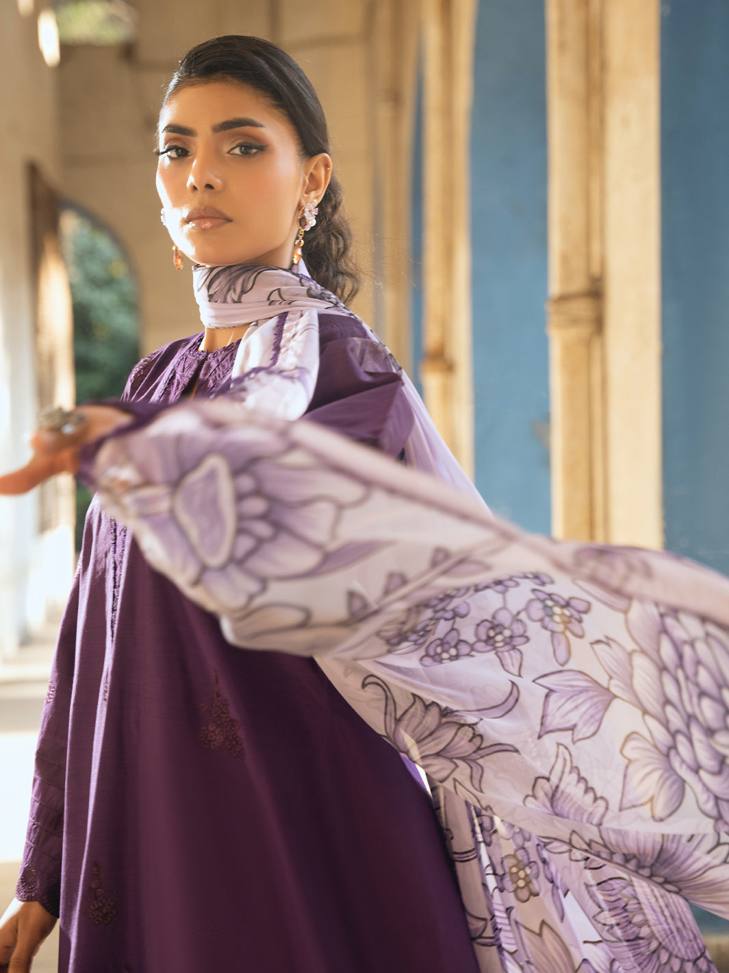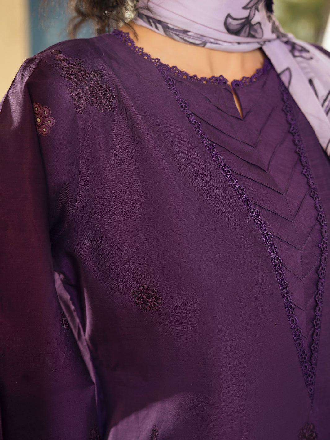 Regal purple ensemble featuring boaring embroidery on shirt. Paired with embroidered farshi shalwar and silk sublimation printed dupatta for a luxurious traditional appeal.