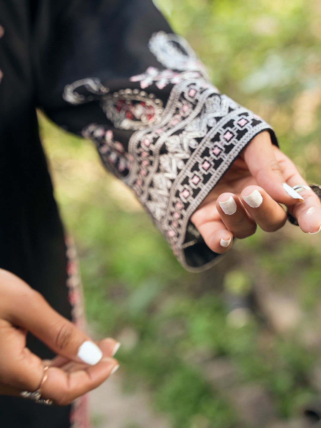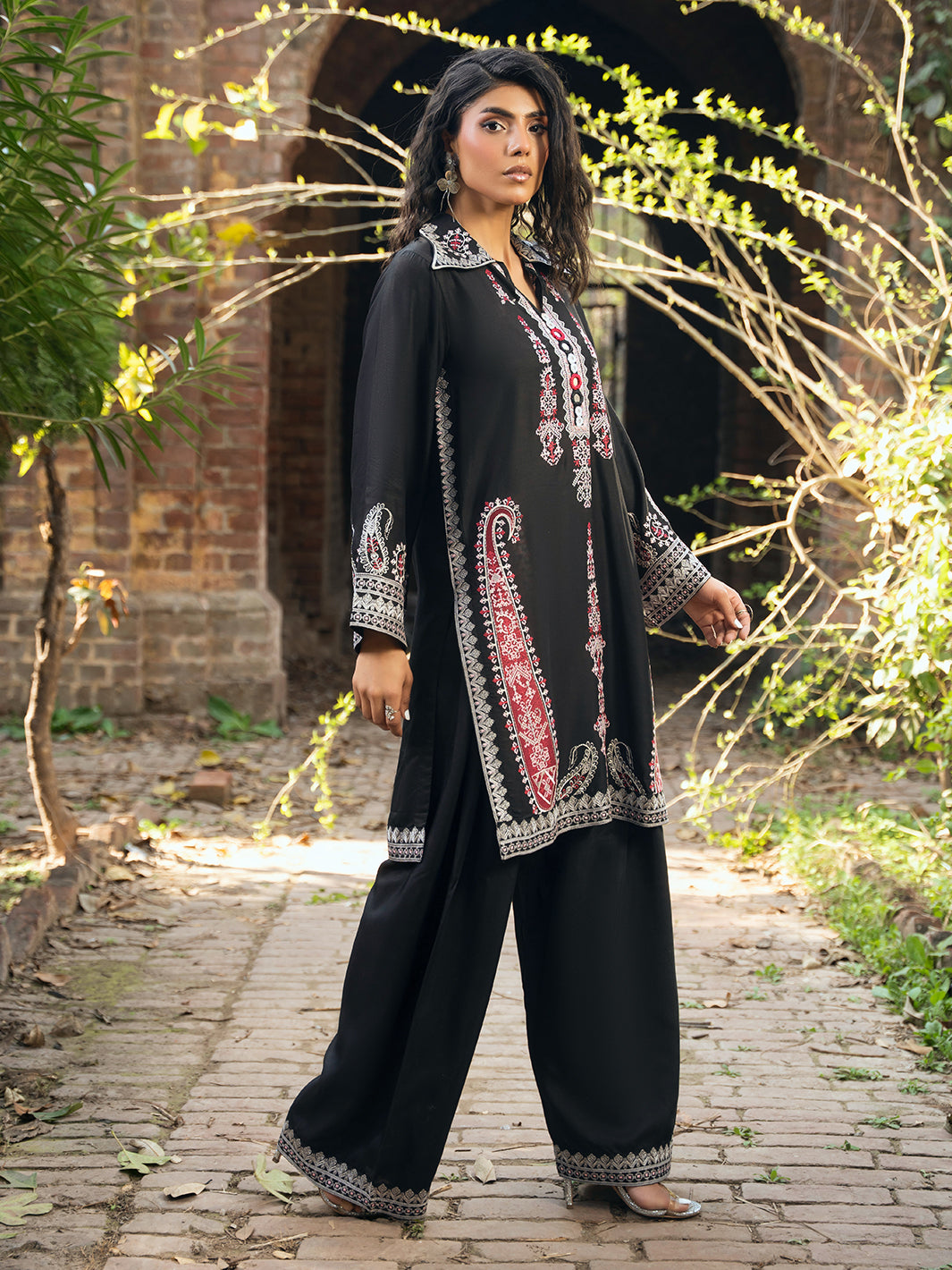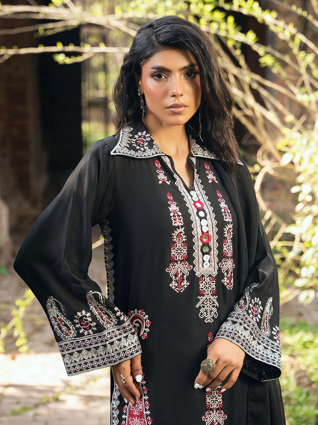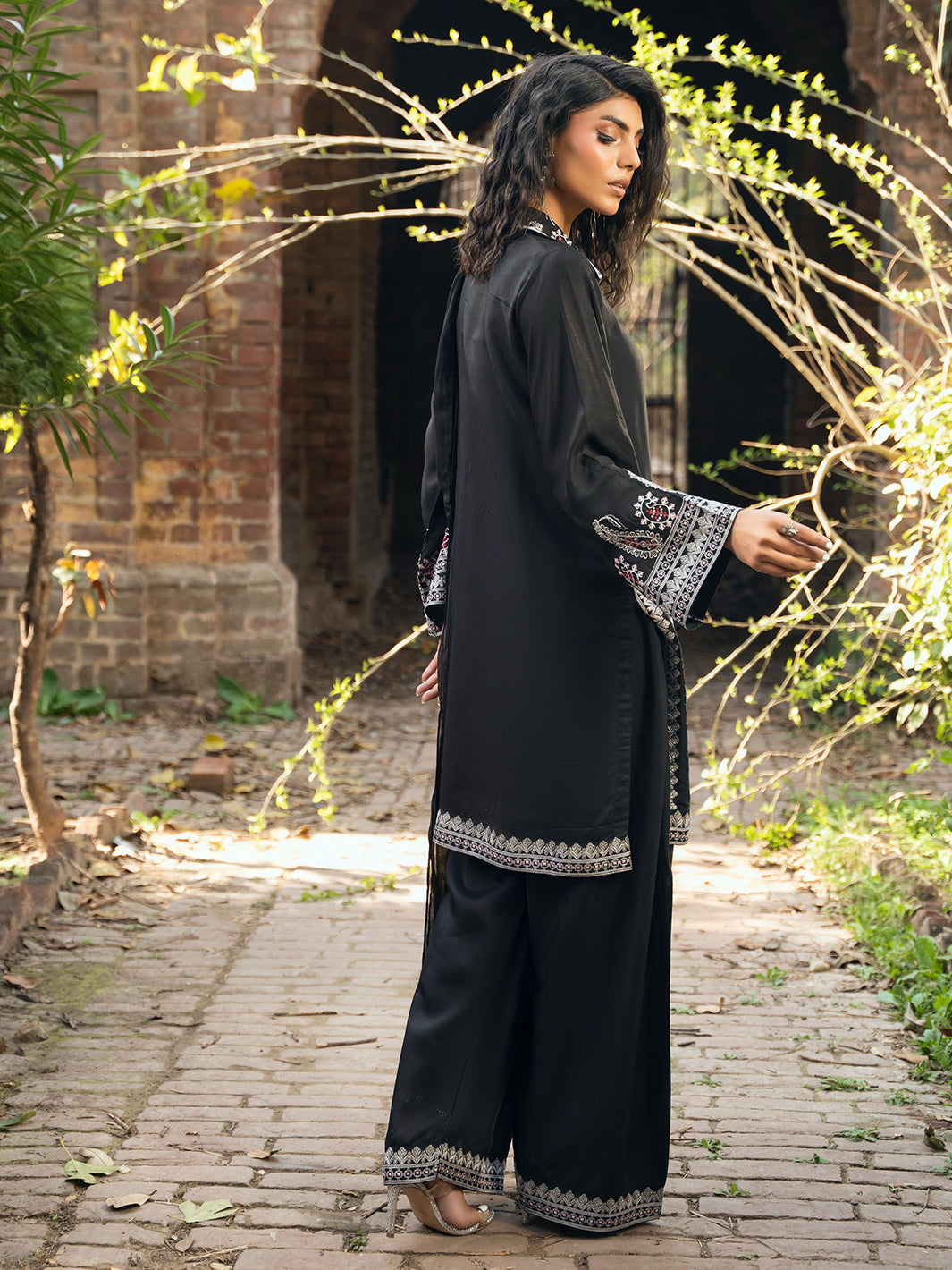 Timeless black outfit with multi-head embroidery on shirt. Styled with farshi shalwar and organza dupatta featuring embroidered corner patches and shuttle lace on all sides.