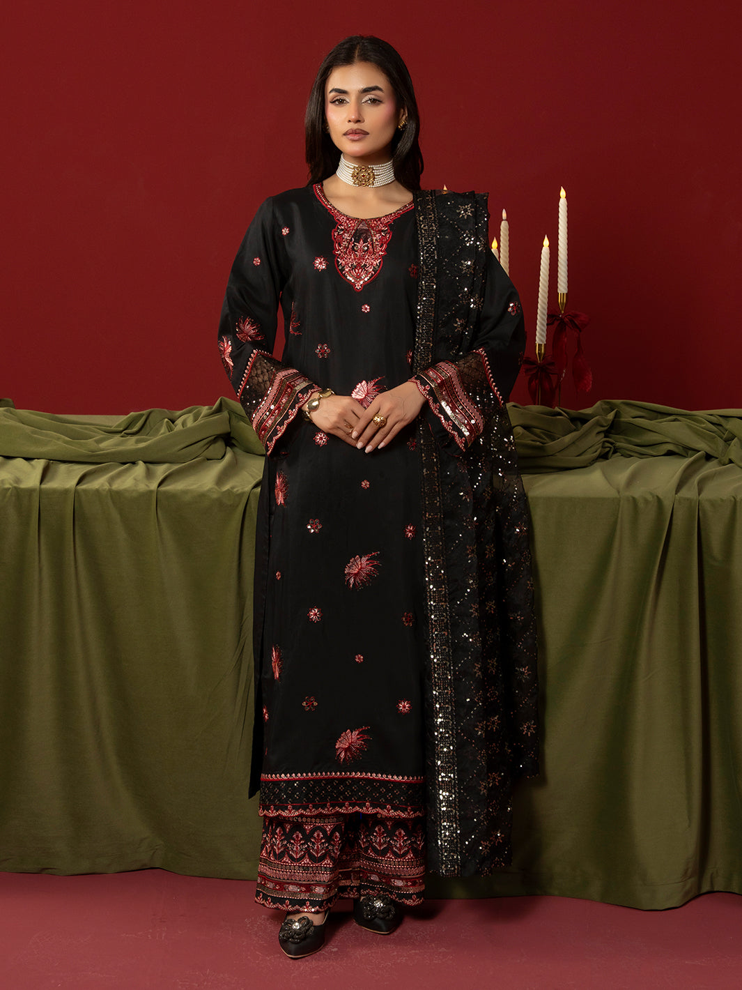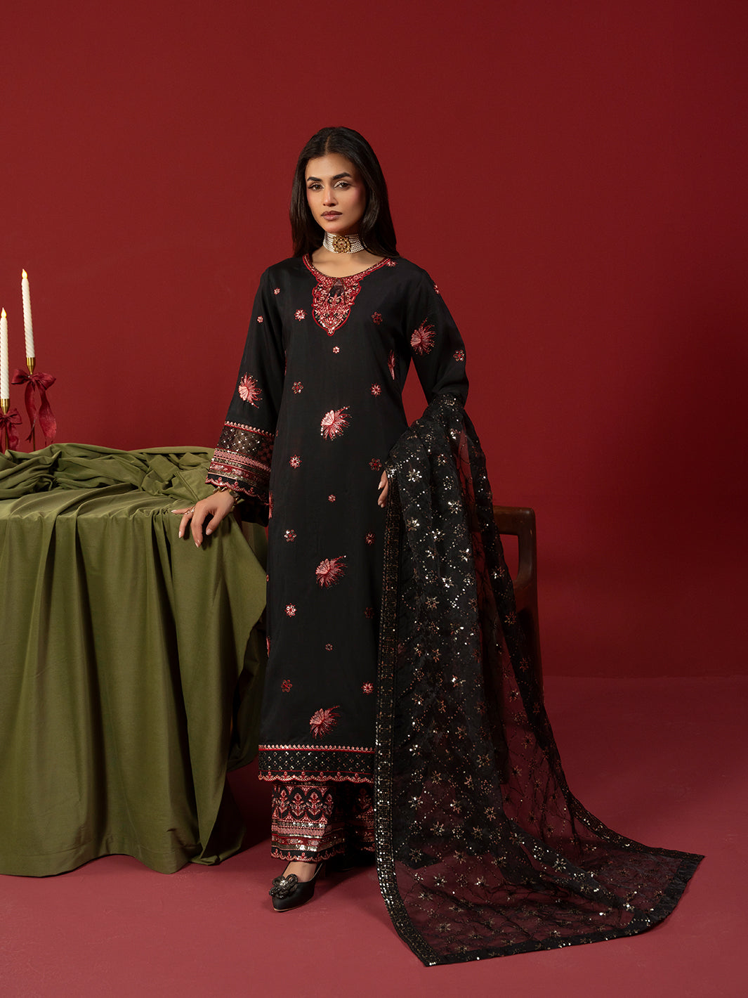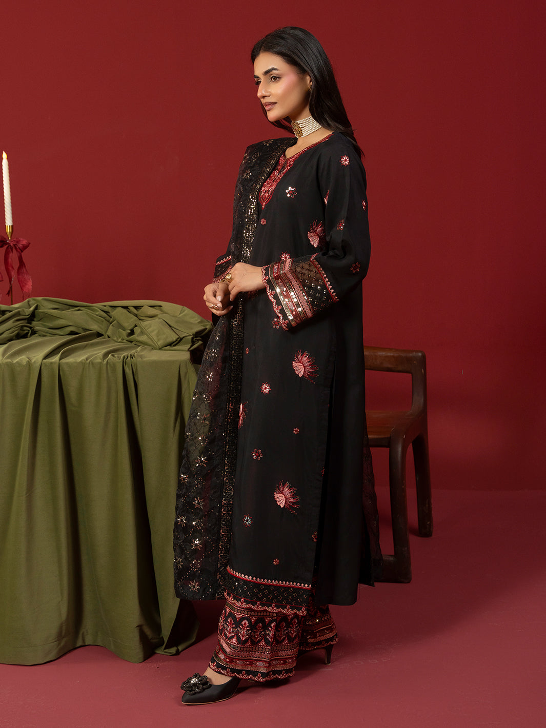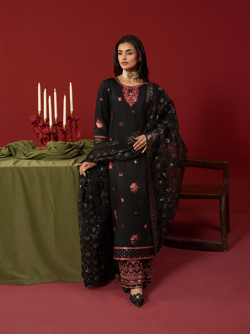 A refined black ensemble crafted in viscose featuring an intricately embroidered shirt paired with embroidered plazo trousers. The embroidered organza dupatta completes the look with graceful charm.