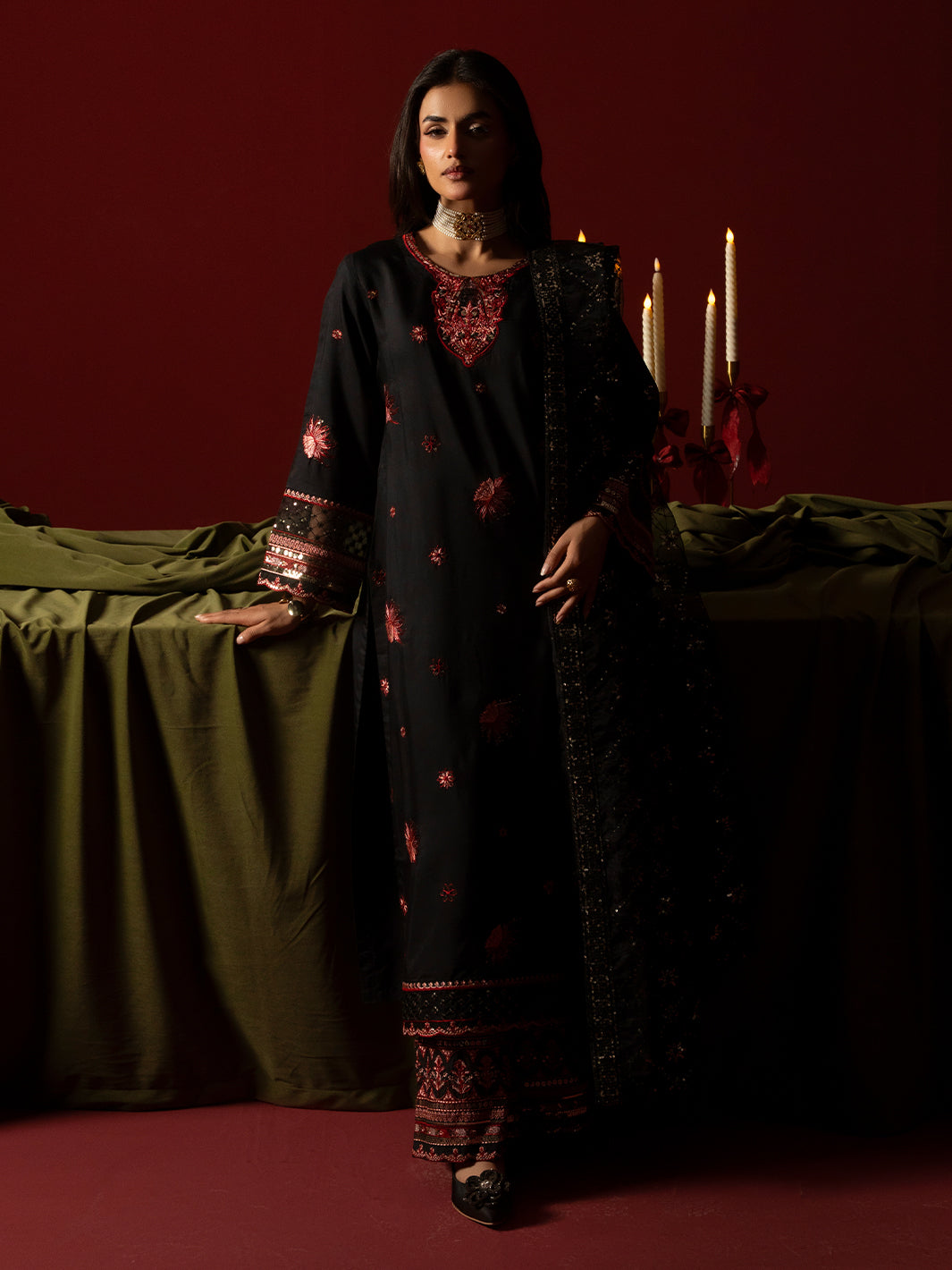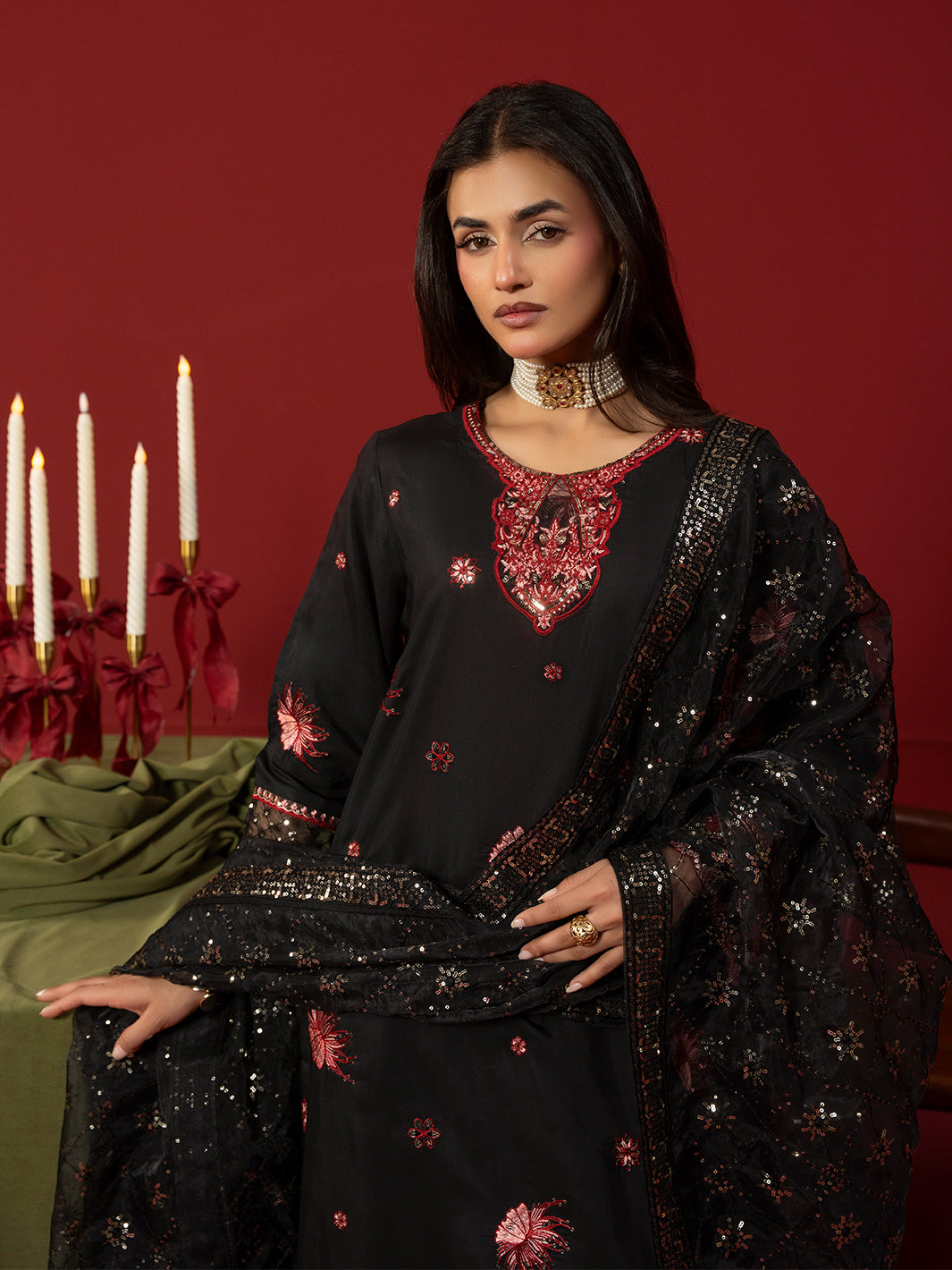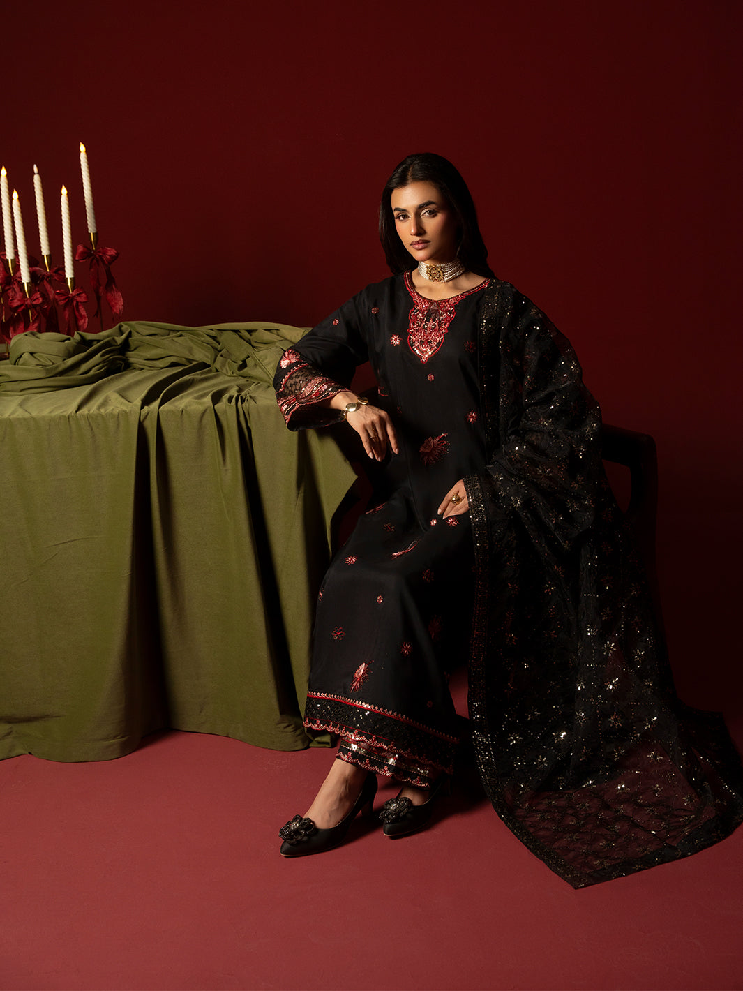 A refined black ensemble crafted in viscose featuring an intricately embroidered shirt paired with embroidered plazo trousers. The embroidered organza dupatta completes the look with graceful charm.