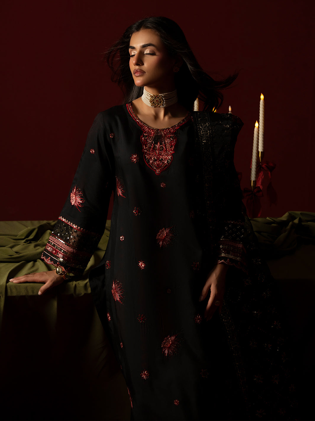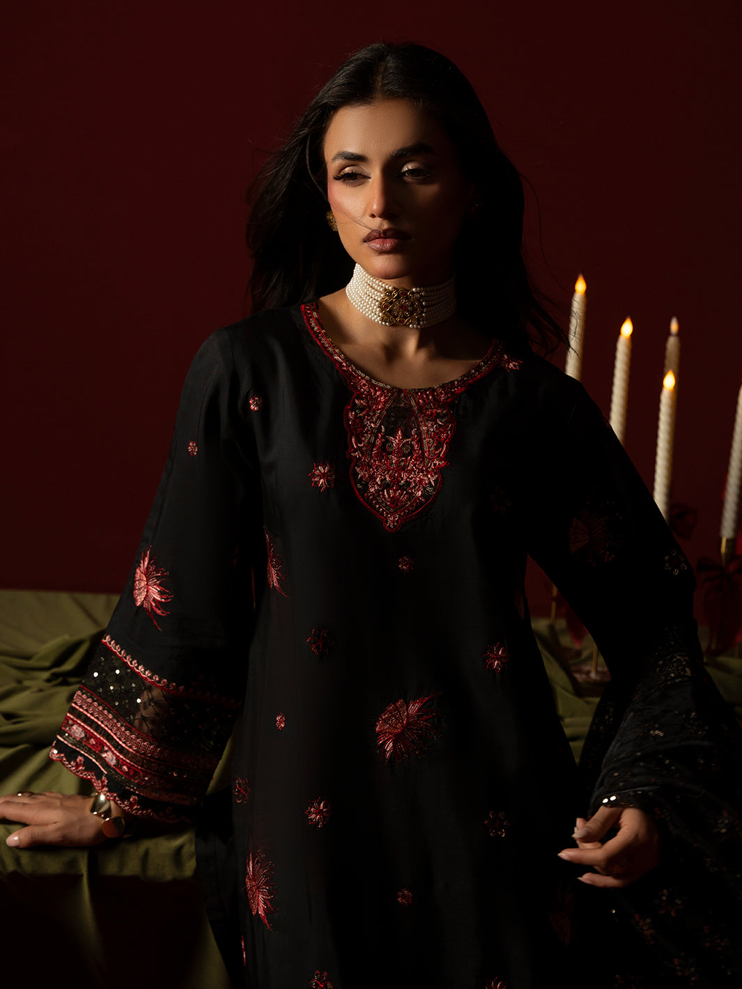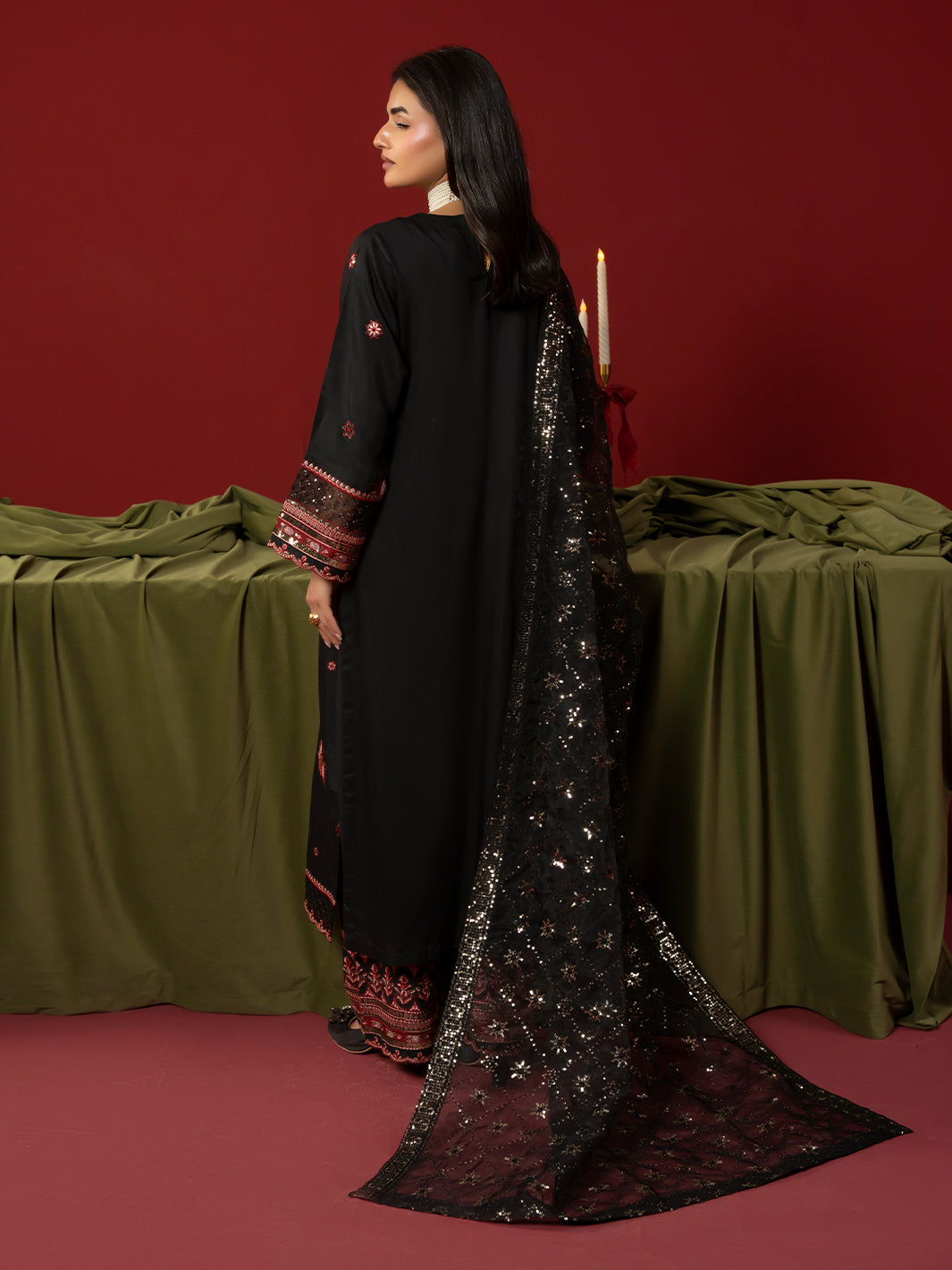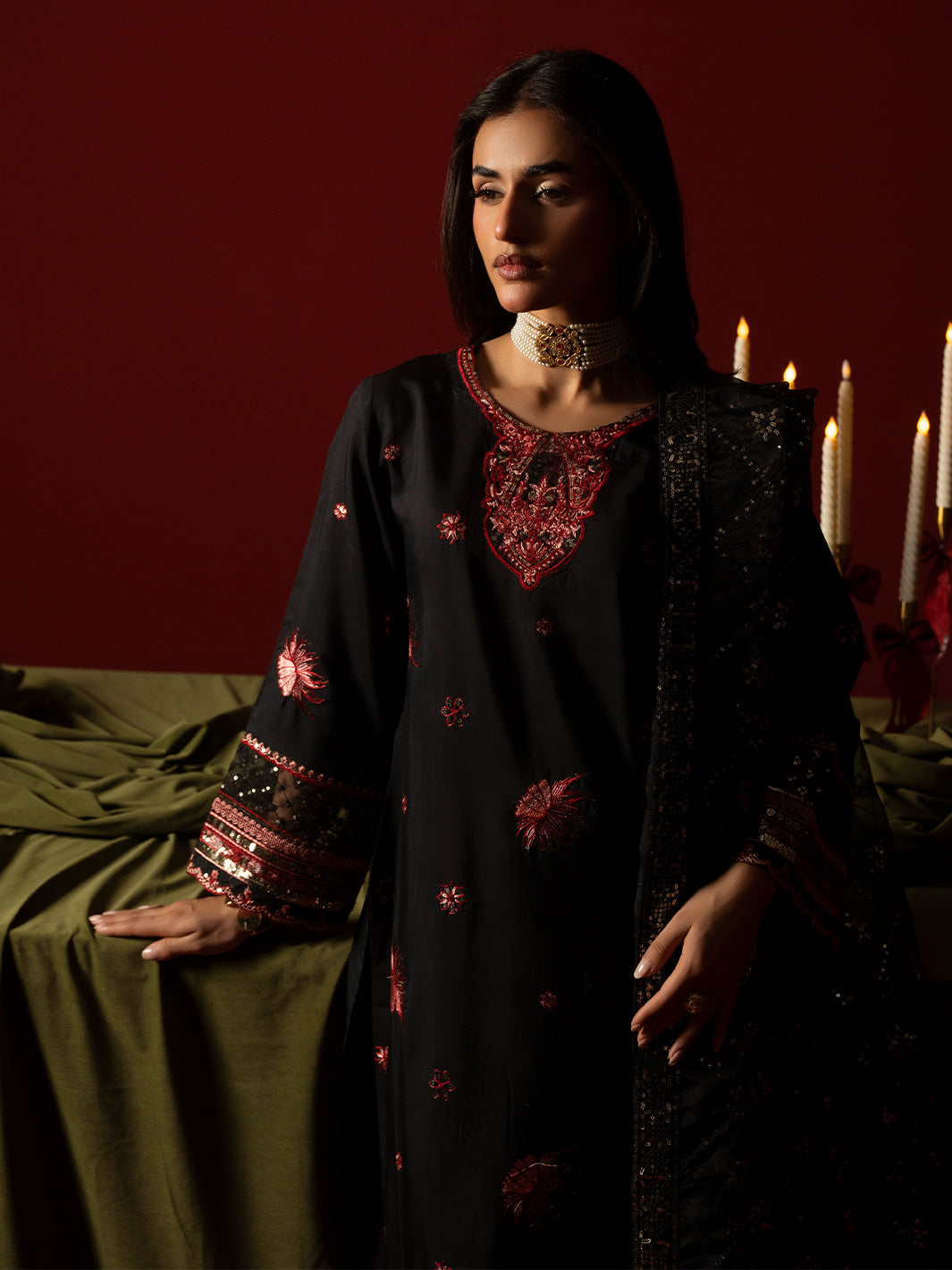 A refined black ensemble crafted in viscose featuring an intricately embroidered shirt paired with embroidered plazo trousers. The embroidered organza dupatta completes the look with graceful charm.