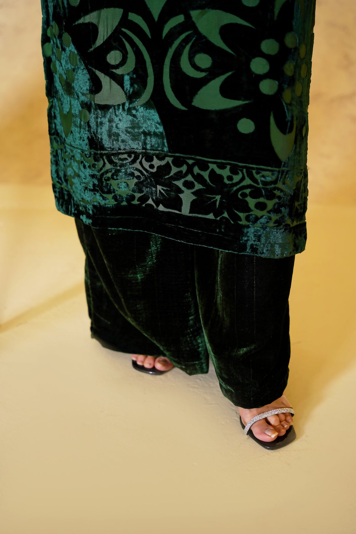 Refresh your winter collection with this Premium Designing Velvet Suit, beautifully made from soft and rich premium designing velvet for a luxurious feel. The deep emerald green shade paired with artistic velvet floral patterns delivers a refined yet striking look. Featuring a delicately styled neckline, coordinated trousers, and a flowing dupatta, this suit is ideal for festive wear, winter events, and evening occasions with a touch of elegance.
