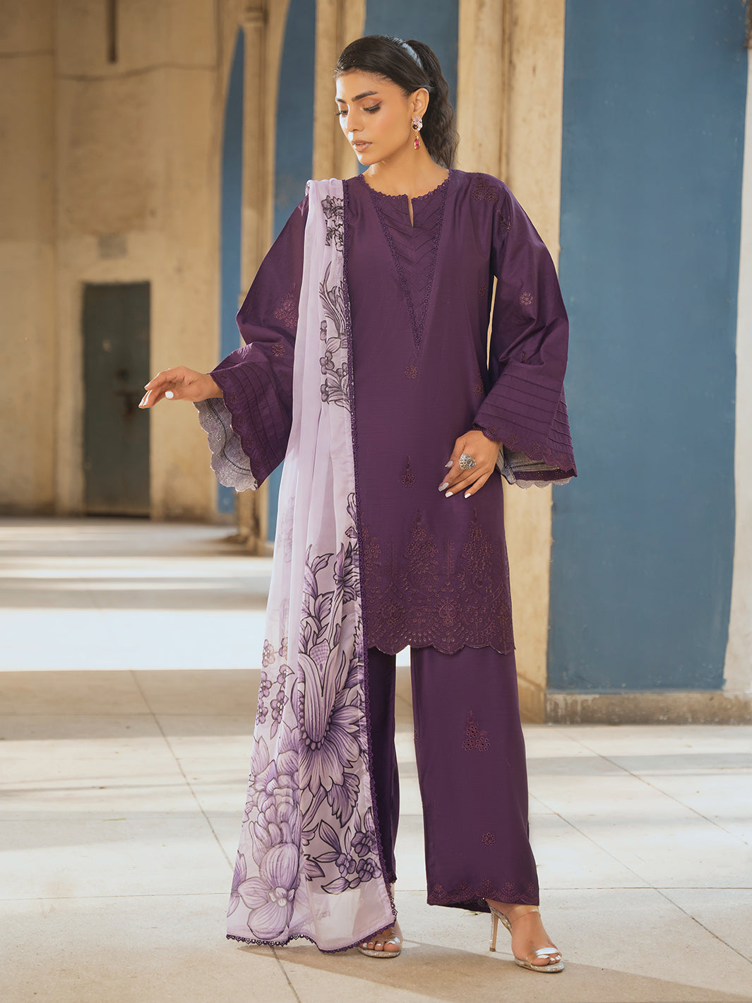 Regal purple ensemble featuring boaring embroidery on shirt. Paired with embroidered farshi shalwar and silk sublimation printed dupatta for a luxurious traditional appeal.