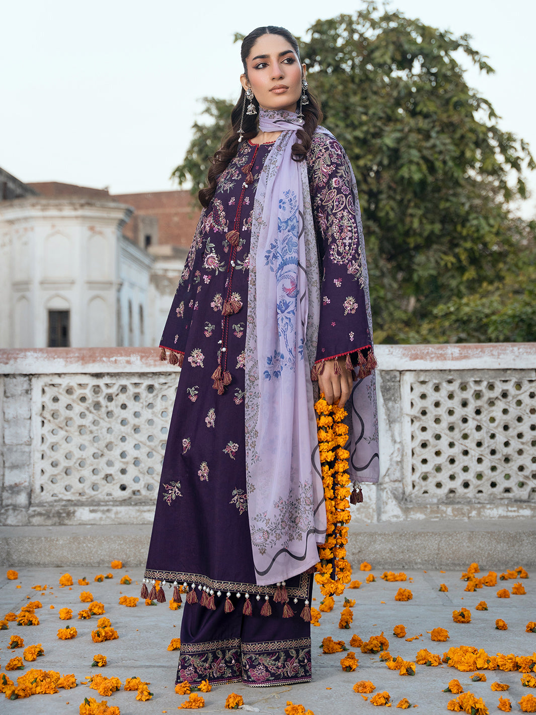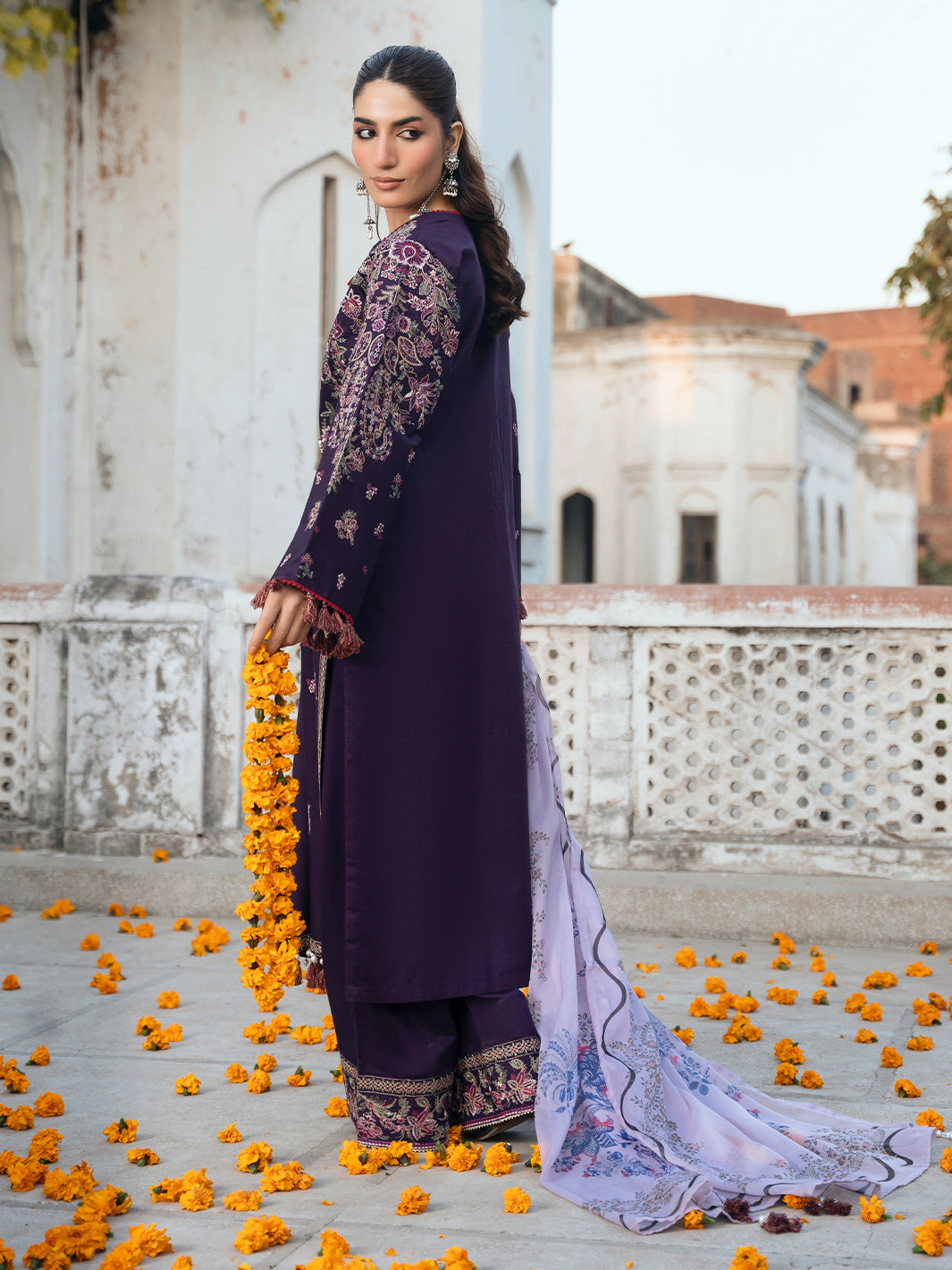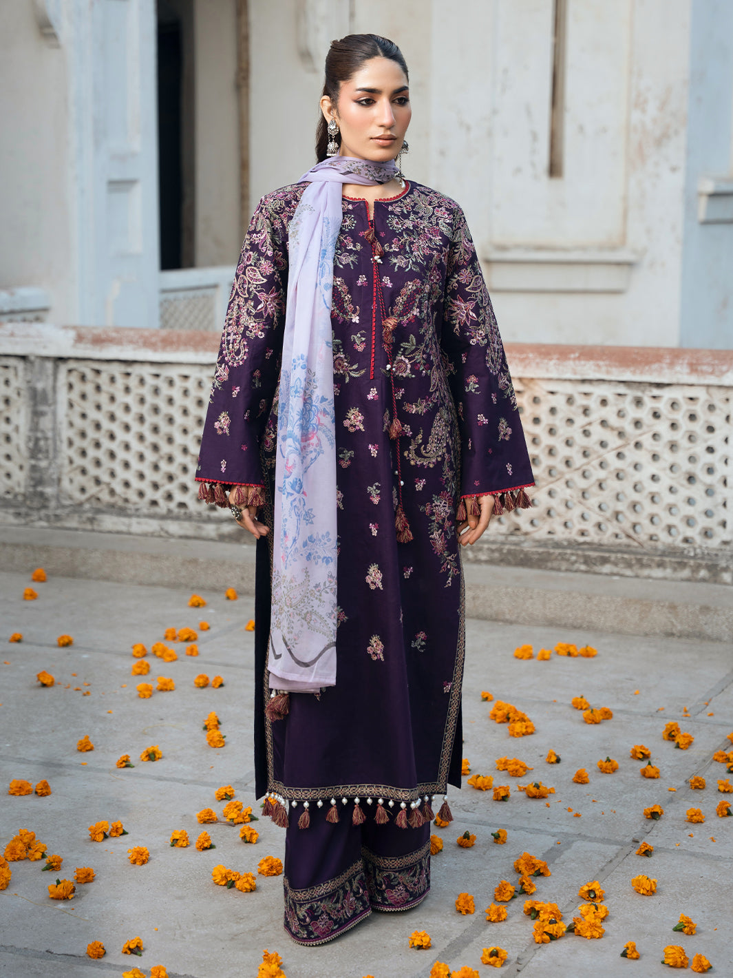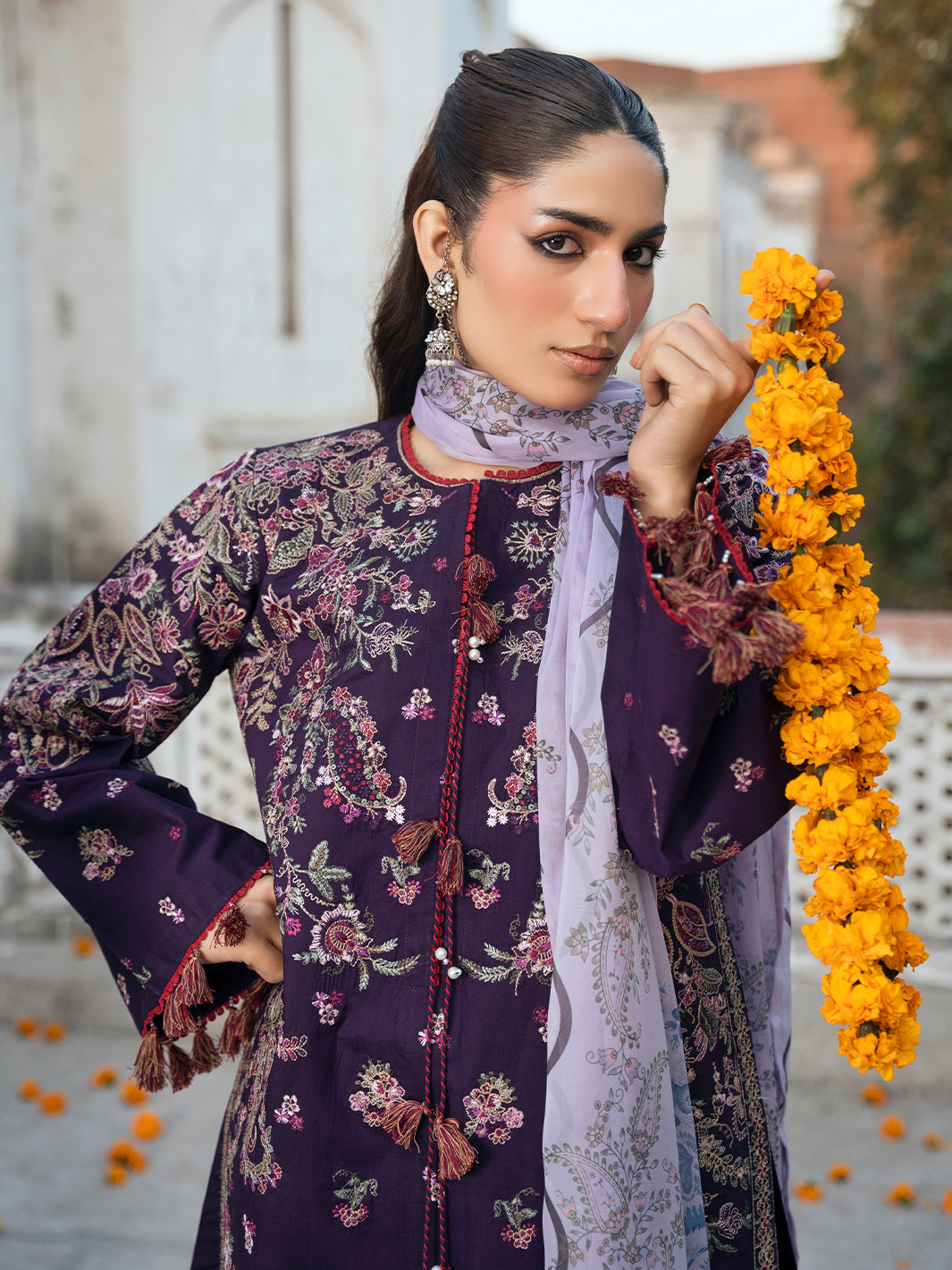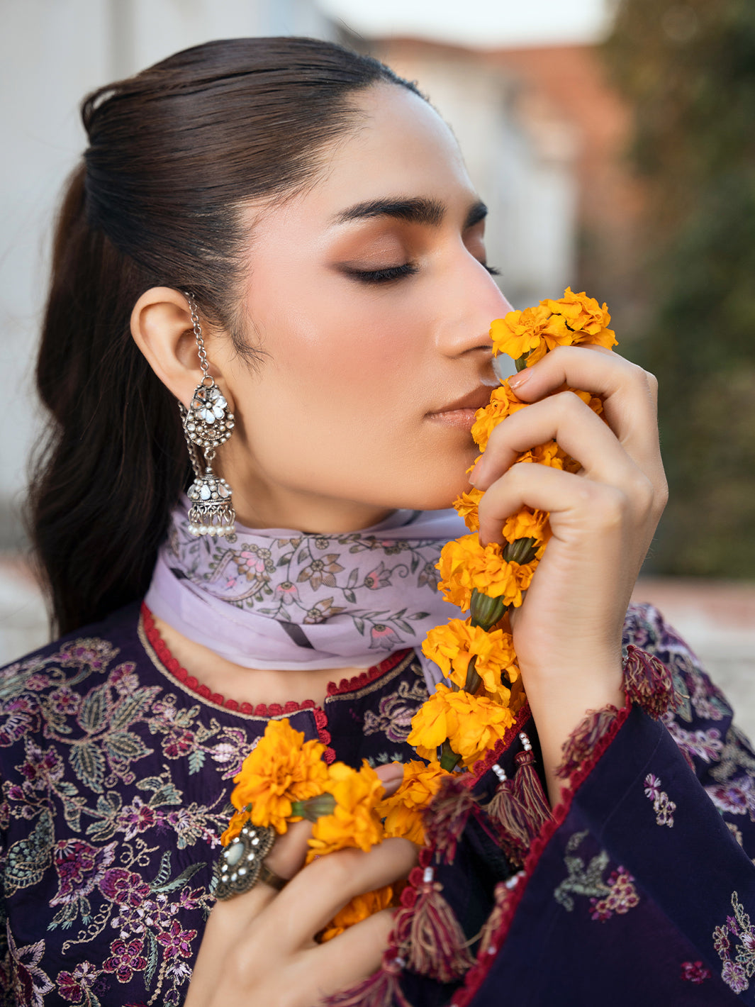 Deep purple formal outfit with multi-head thread embroidery and lace detailing. Thread tassels on neckline, sleeves and hem. Styled with flared palazzo and sublimation printed voile dupatta.