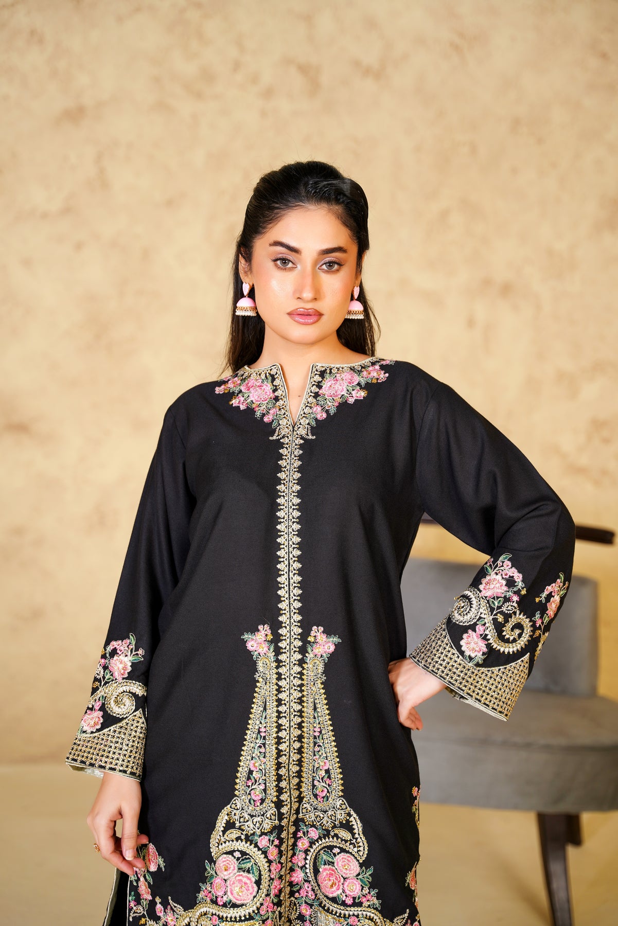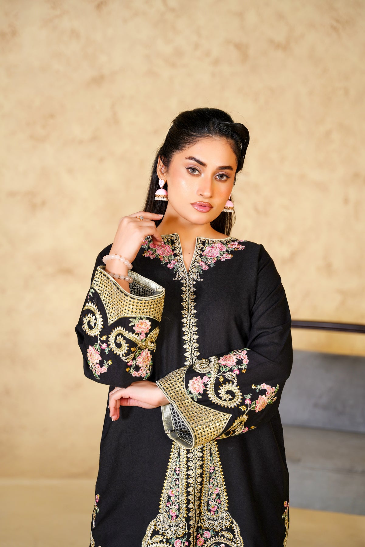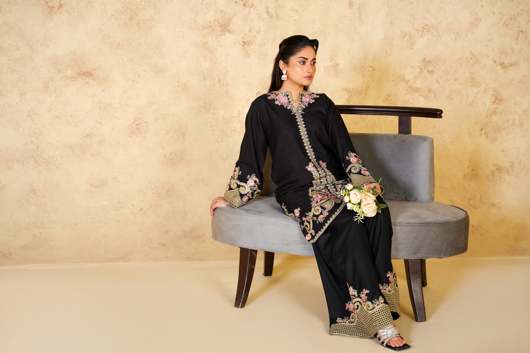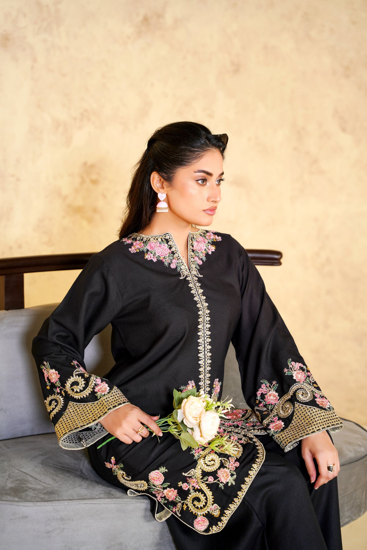 Step into timeless elegance with the Midnight Bloom viscose suit, beautifully adorned with intricate floral embroidery over a classic black base. Crafted from premium viscose fabric, this outfit offers a soft, breathable feel while maintaining a graceful winter look. The detailed embroidery on the neckline, sleeves, and hem adds a luxurious touch, making it perfect for evening gatherings, festive dinners, and formal occasions.