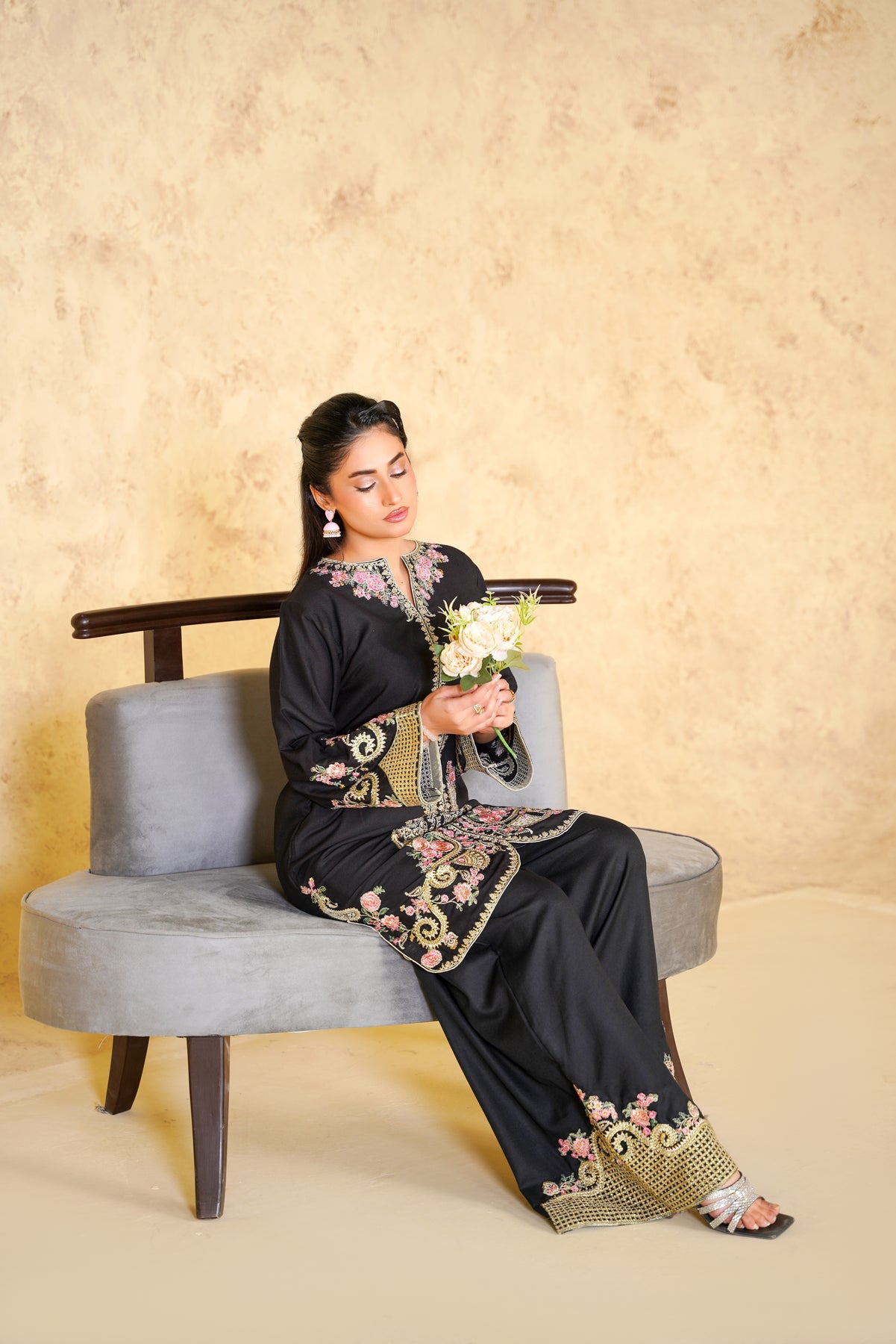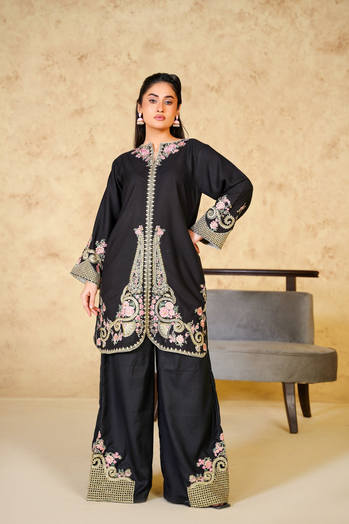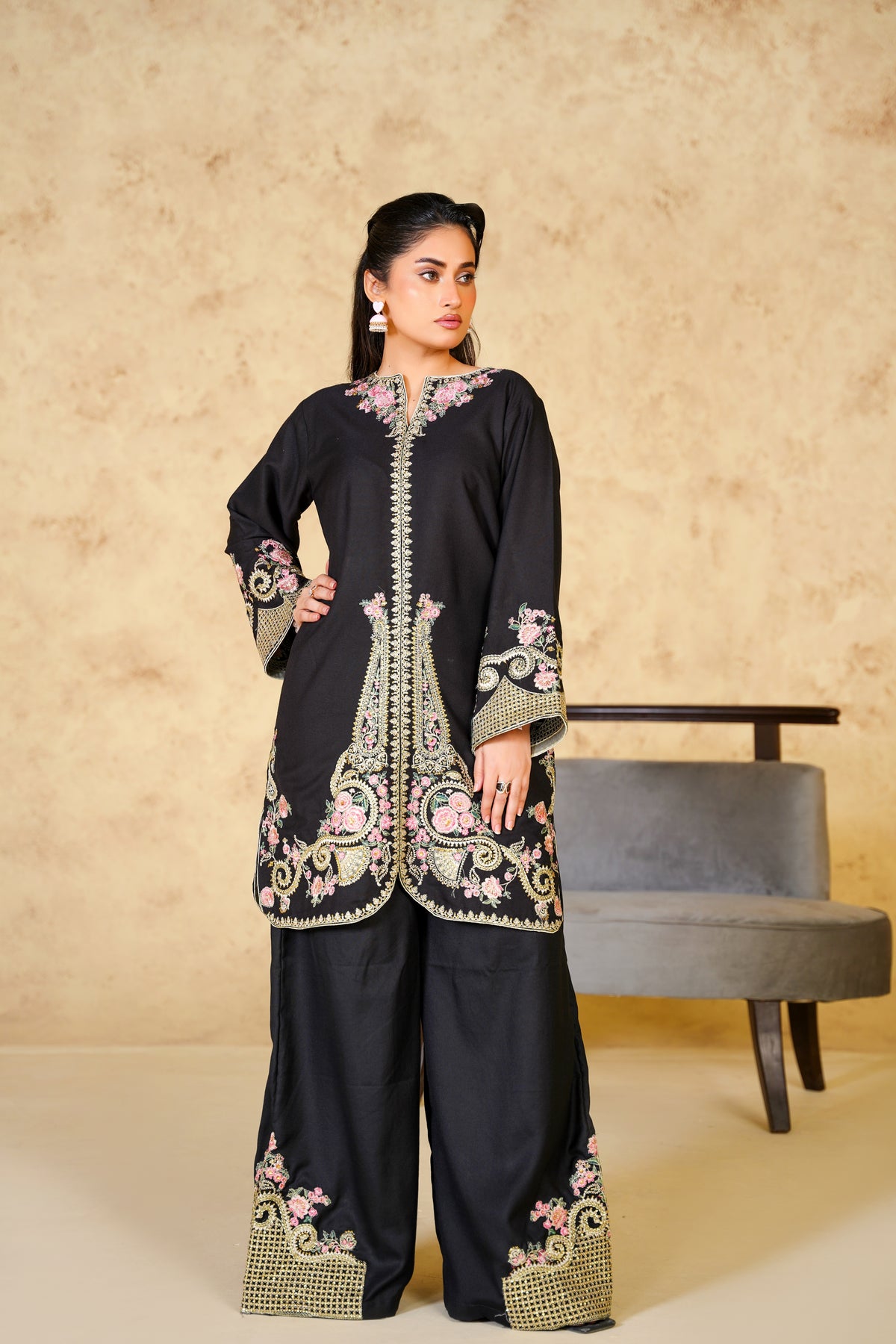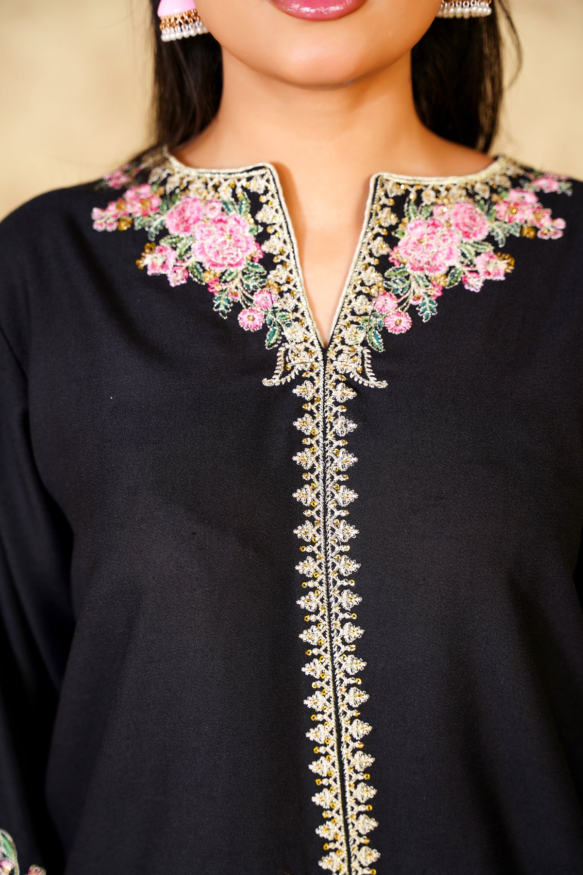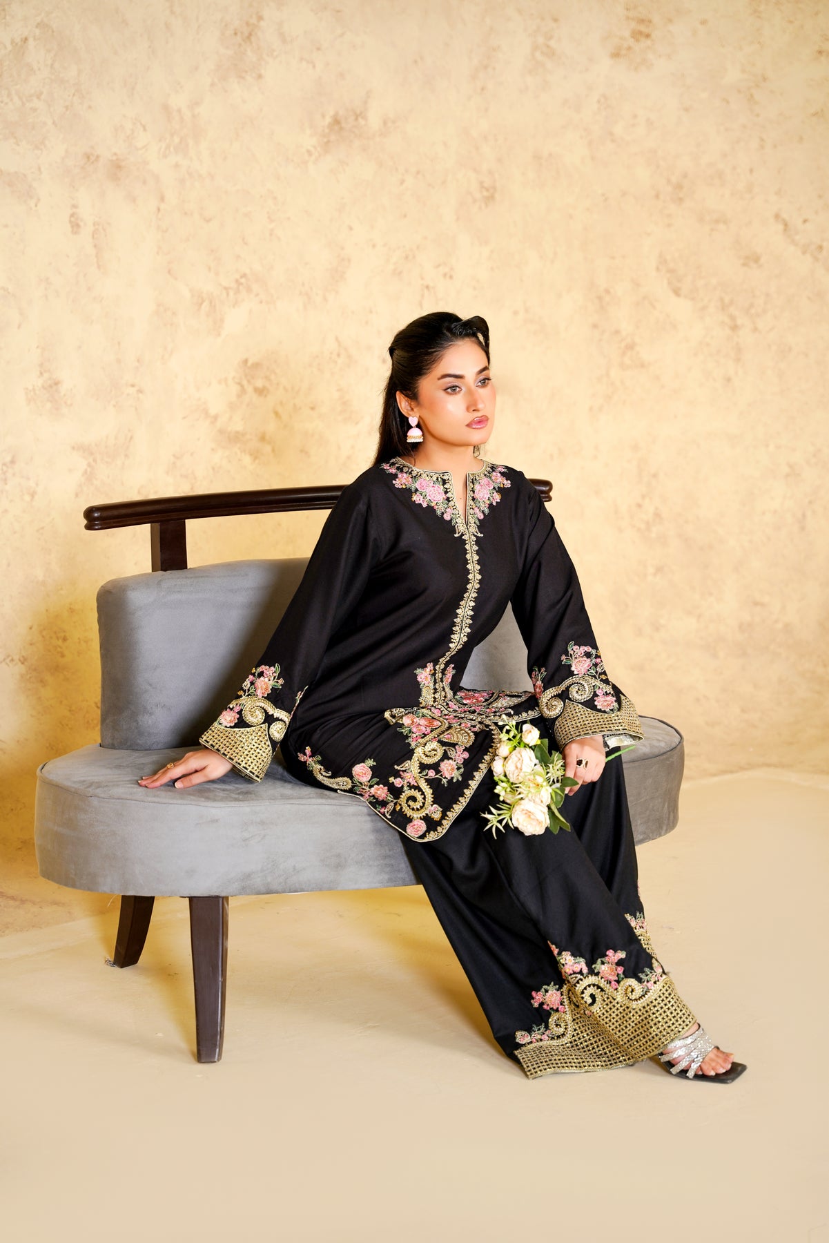 Step into timeless elegance with the Midnight Bloom viscose suit, beautifully adorned with intricate floral embroidery over a classic black base. Crafted from premium viscose fabric, this outfit offers a soft, breathable feel while maintaining a graceful winter look. The detailed embroidery on the neckline, sleeves, and hem adds a luxurious touch, making it perfect for evening gatherings, festive dinners, and formal occasions.