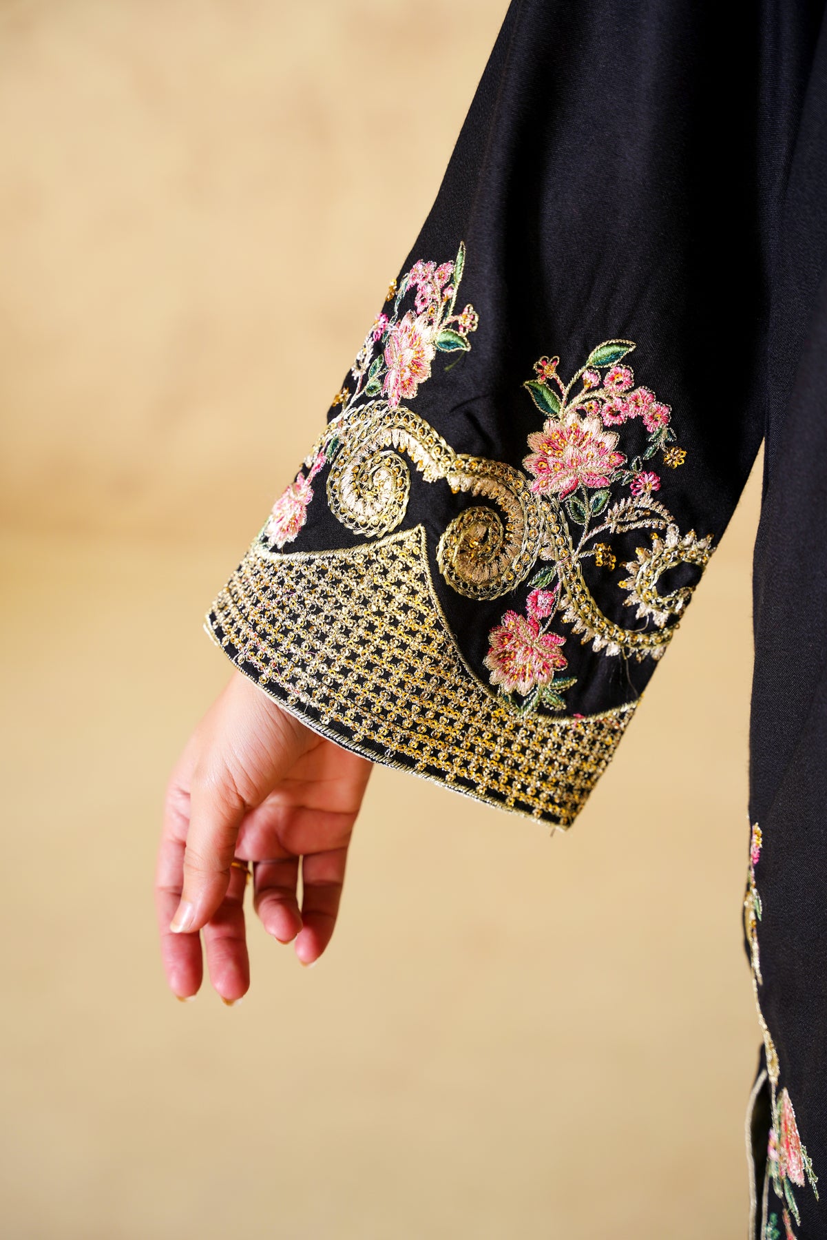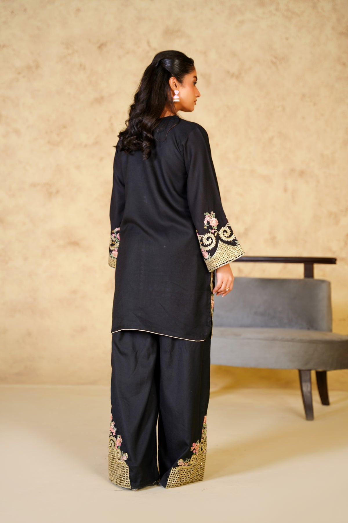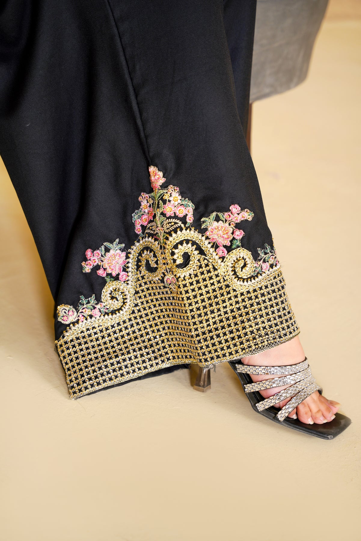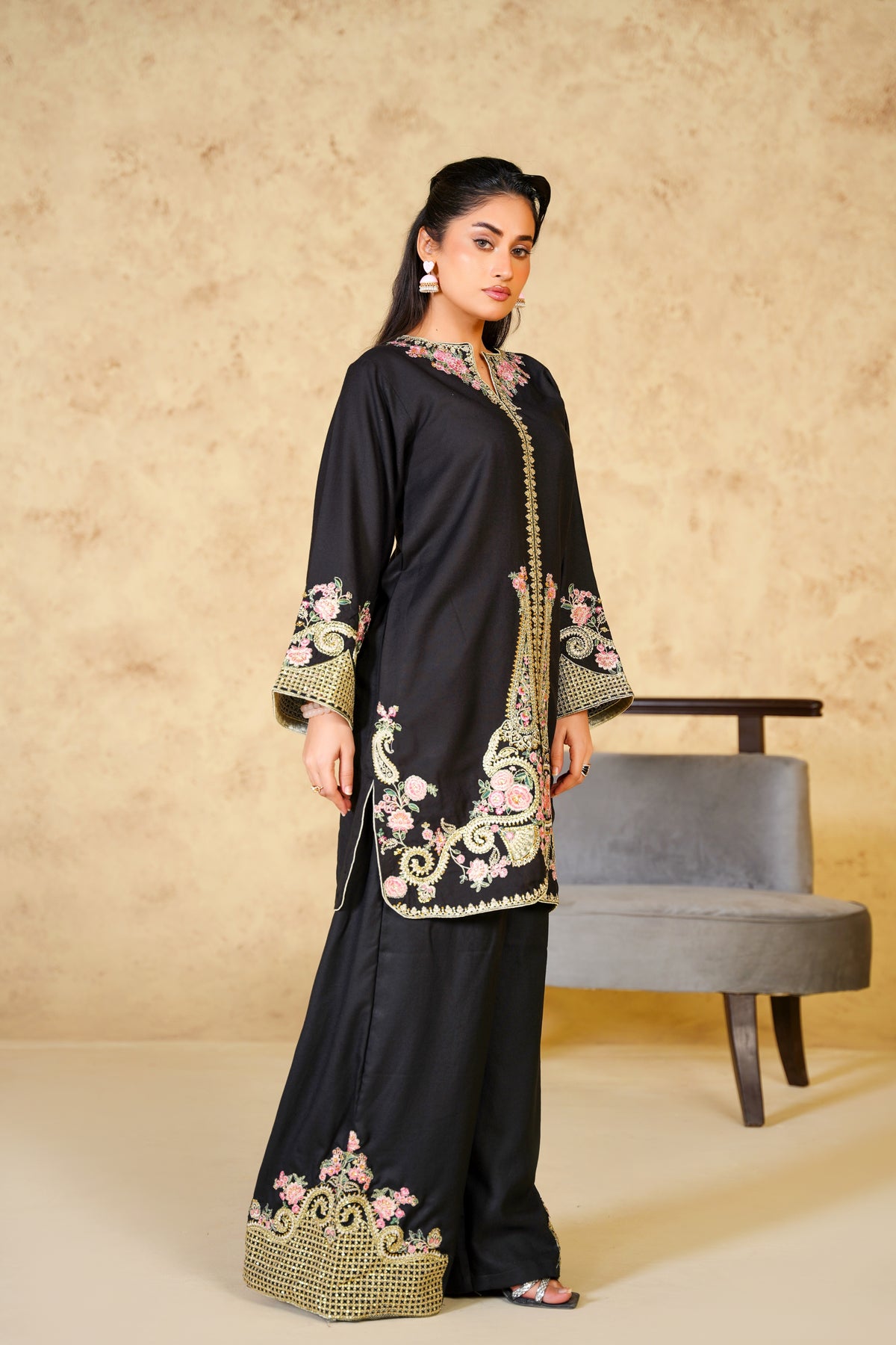 Step into timeless elegance with the Midnight Bloom viscose suit, beautifully adorned with intricate floral embroidery over a classic black base. Crafted from premium viscose fabric, this outfit offers a soft, breathable feel while maintaining a graceful winter look. The detailed embroidery on the neckline, sleeves, and hem adds a luxurious touch, making it perfect for evening gatherings, festive dinners, and formal occasions.