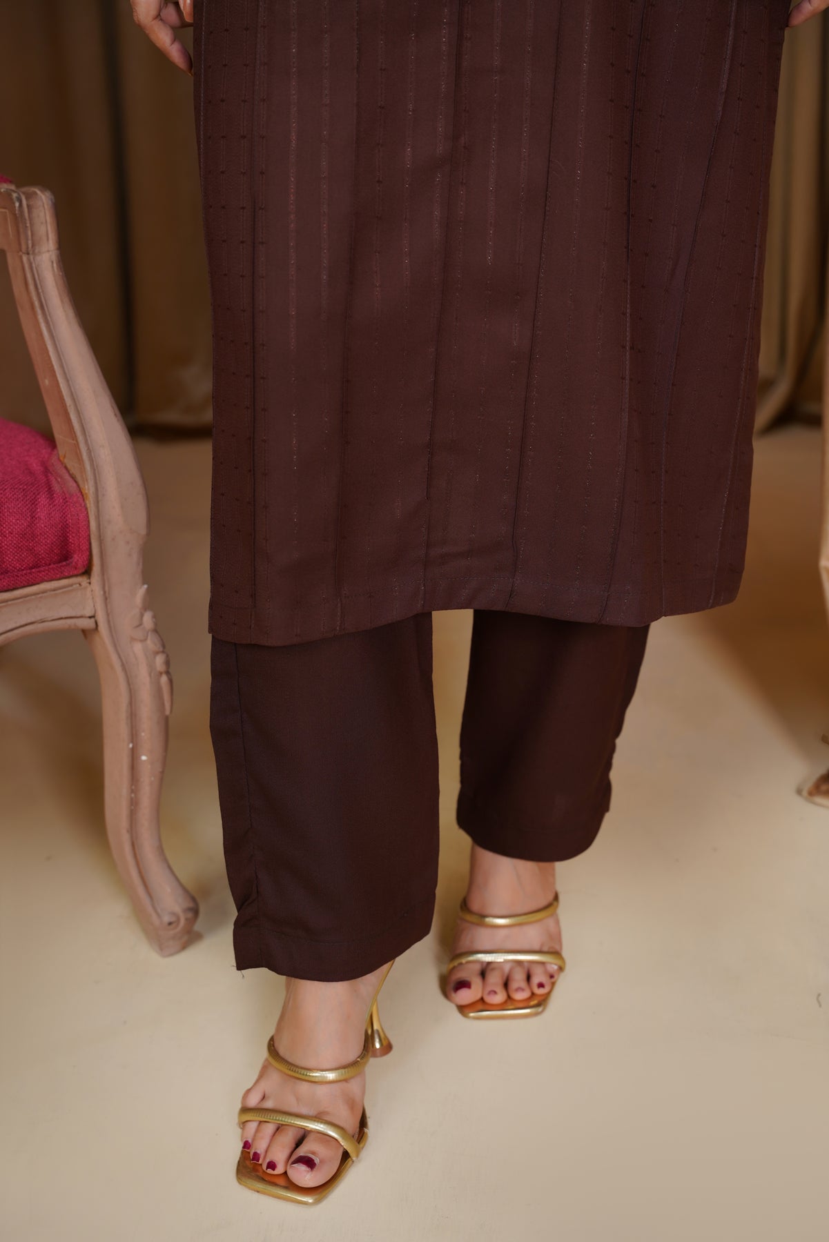 mbrace understated elegance with the Mocha Muse – Chocolate Brown 3Pc Suit. This rich mocha-brown ensemble exudes warmth and sophistication, making it a perfect addition to your winter wardrobe. The subtle stripe texture and fabric-covered button detailing on the front add a refined touch to its classic silhouette. Tailored from luxurious Premium Dhanak Winter Collection, it offers a soft drape and cozy comfort, ideal for day-to-night wear. Pair it with statement jewelry or keep it minimal — either way, this outfit speaks timeless grace.