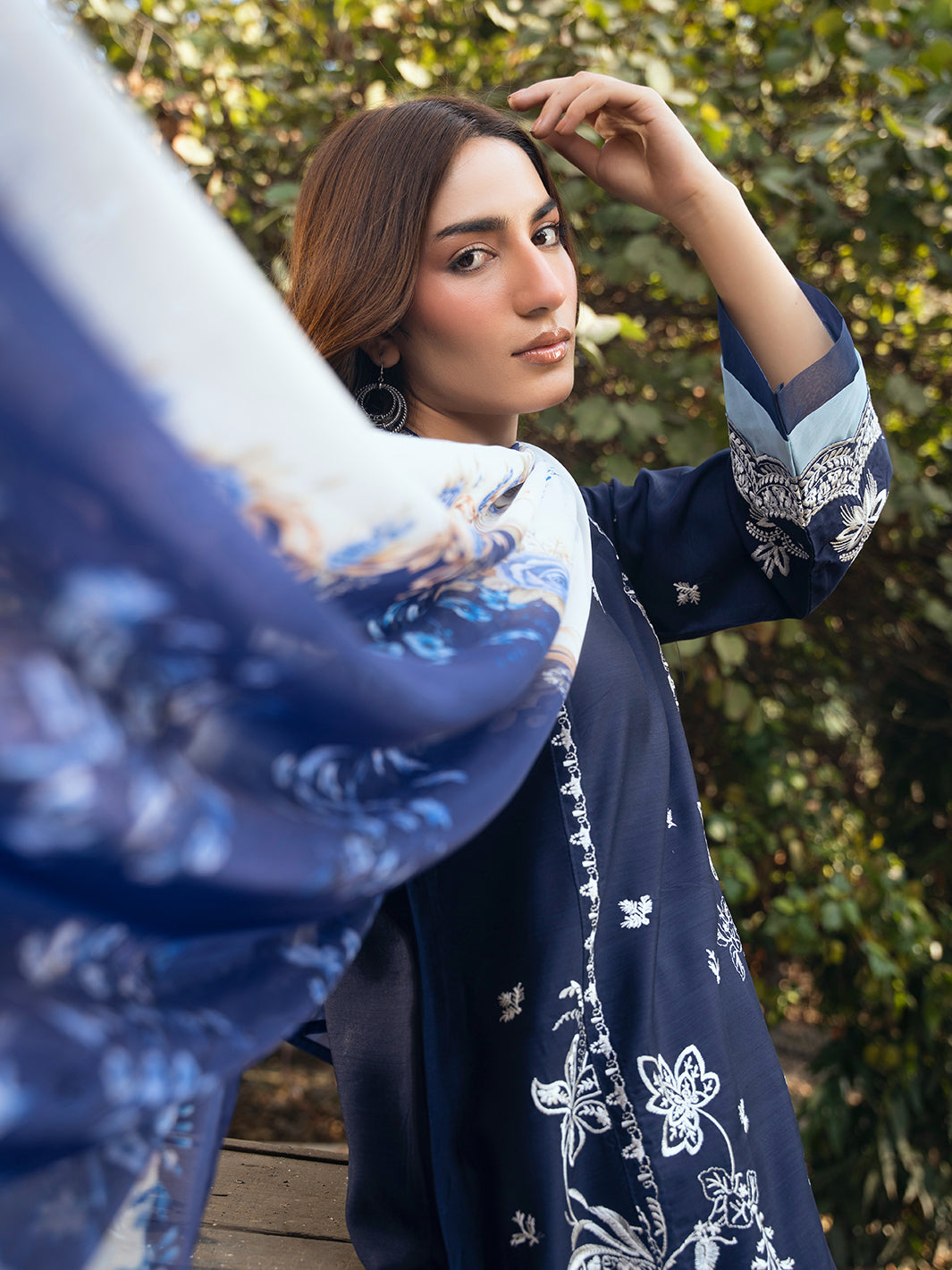 Sophisticated dark blue outfit with multi-head embroidery on shirt. Paired with traditional farshi shalwar and silk printed dupatta for a complete formal look.