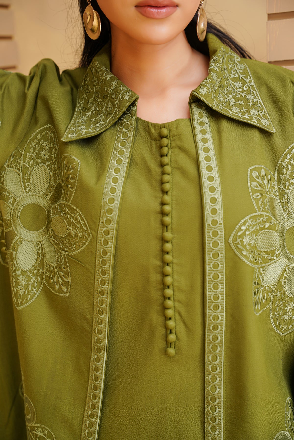 Embrace fresh sophistication with the Olive Bloom 3pc kaftan Dhank  Suit, designed in a soothing olive green shade that exudes calm elegance. Made from breathable and lightweight Dhank fabric, this suit ensures lasting comfort with a polished finish. Soft floral motifs and a clean silhouette give the outfit a modern yet traditional charm.