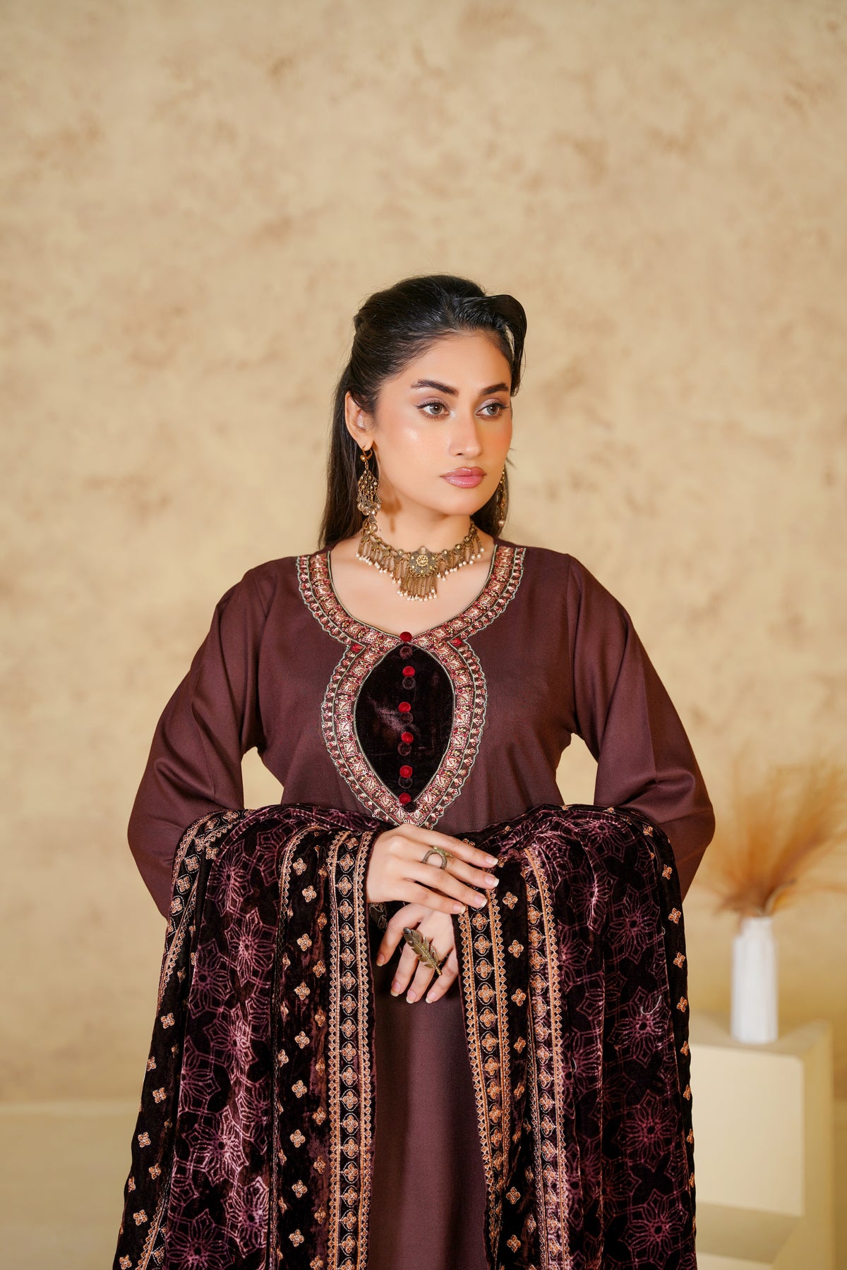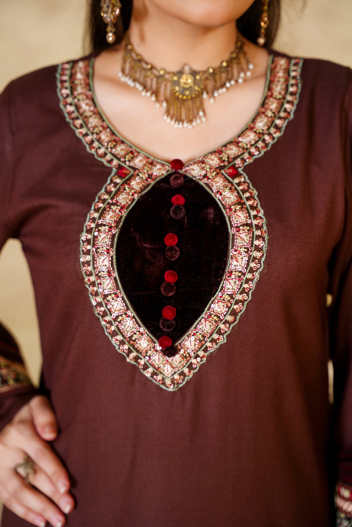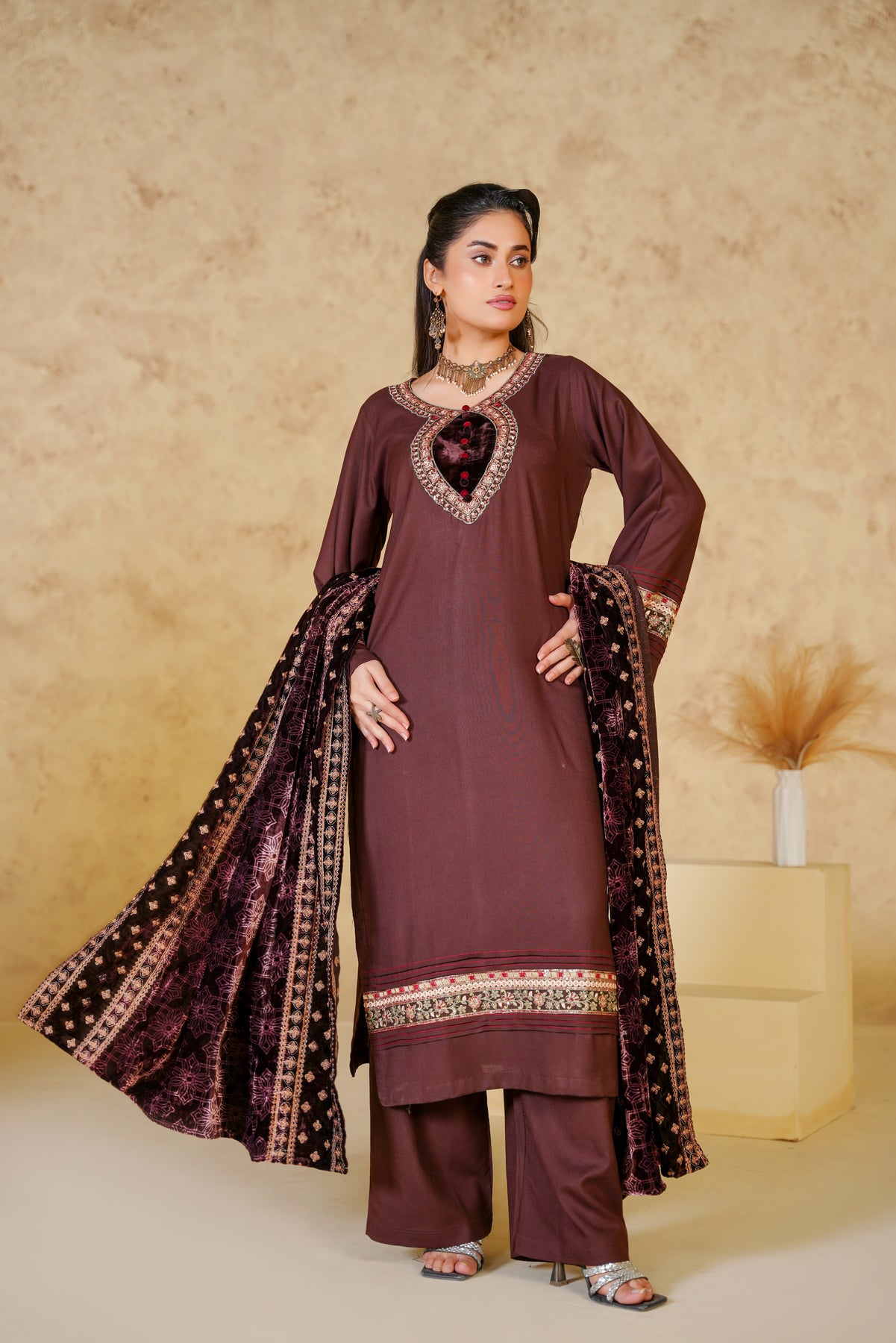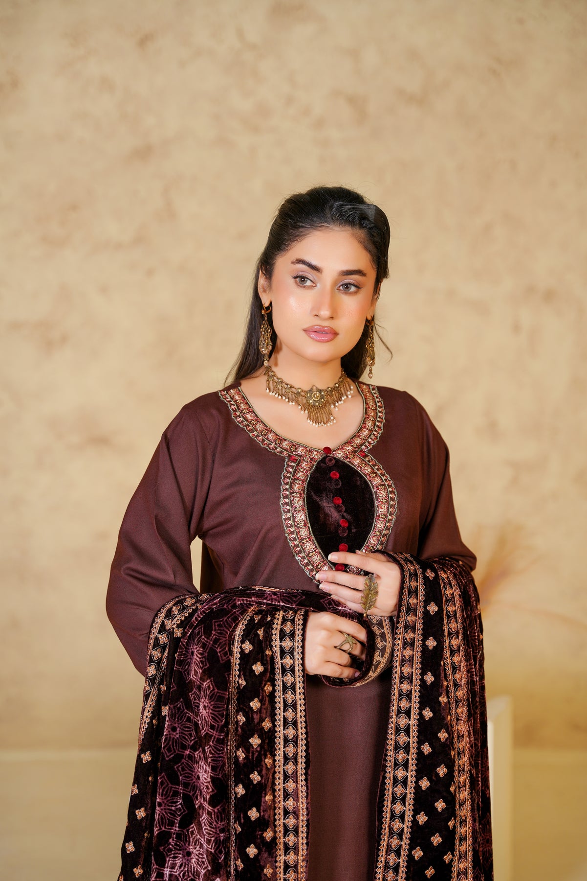 Make a bold yet graceful statement with the Royal Amethyst Dhanak suit, beautifully crafted in a deep brown shade. The elegant floral embroidery enhances the richness of the outfit, while the dhanak fabric ensures warmth and comfort throughout the winter season. Perfect for festive gatherings, evening meet-ups, and winter celebrations, this suit blends traditional charm with modern refinement.