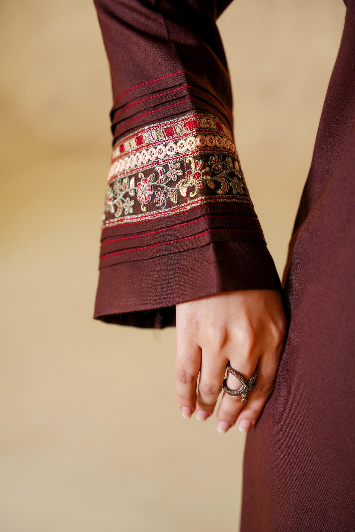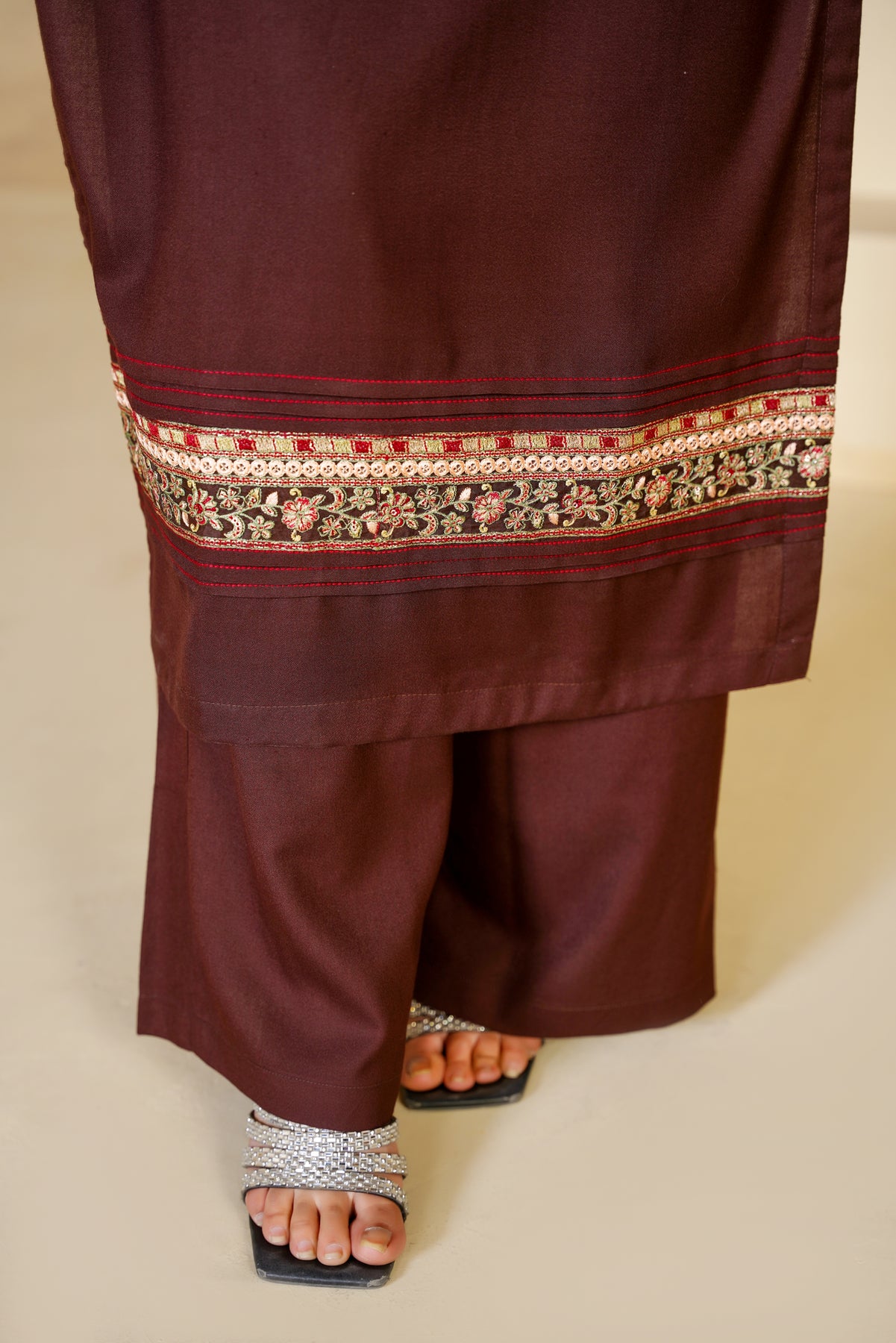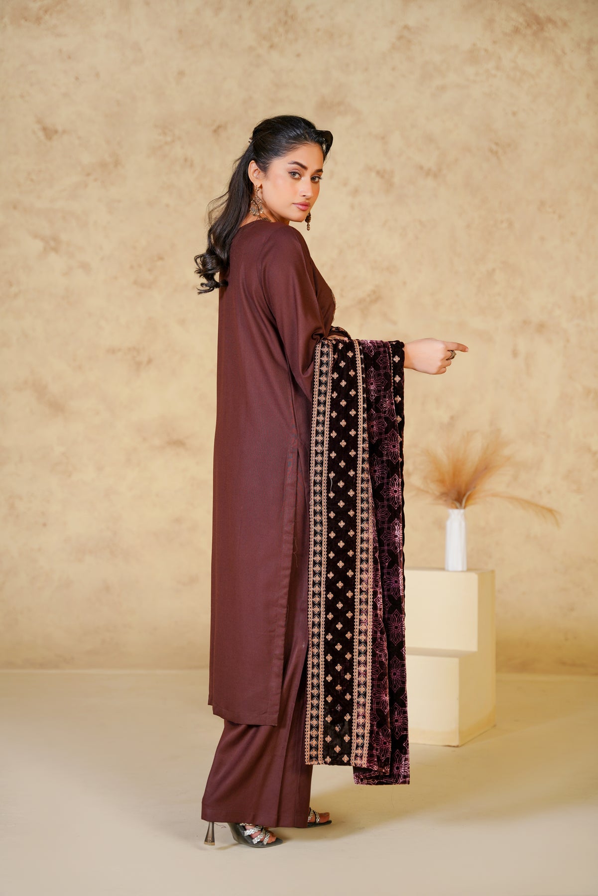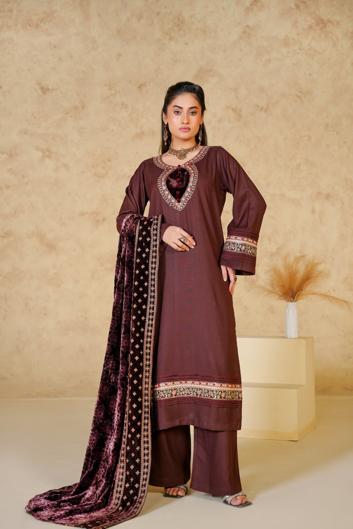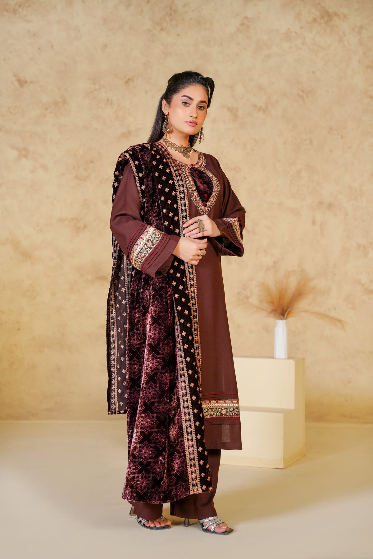 Make a bold yet graceful statement with the Royal Amethyst Dhanak suit, beautifully crafted in a deep brown shade. The elegant floral embroidery enhances the richness of the outfit, while the dhanak fabric ensures warmth and comfort throughout the winter season. Perfect for festive gatherings, evening meet-ups, and winter celebrations, this suit blends traditional charm with modern refinement.