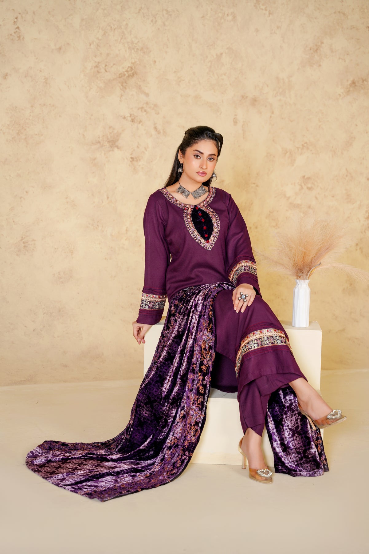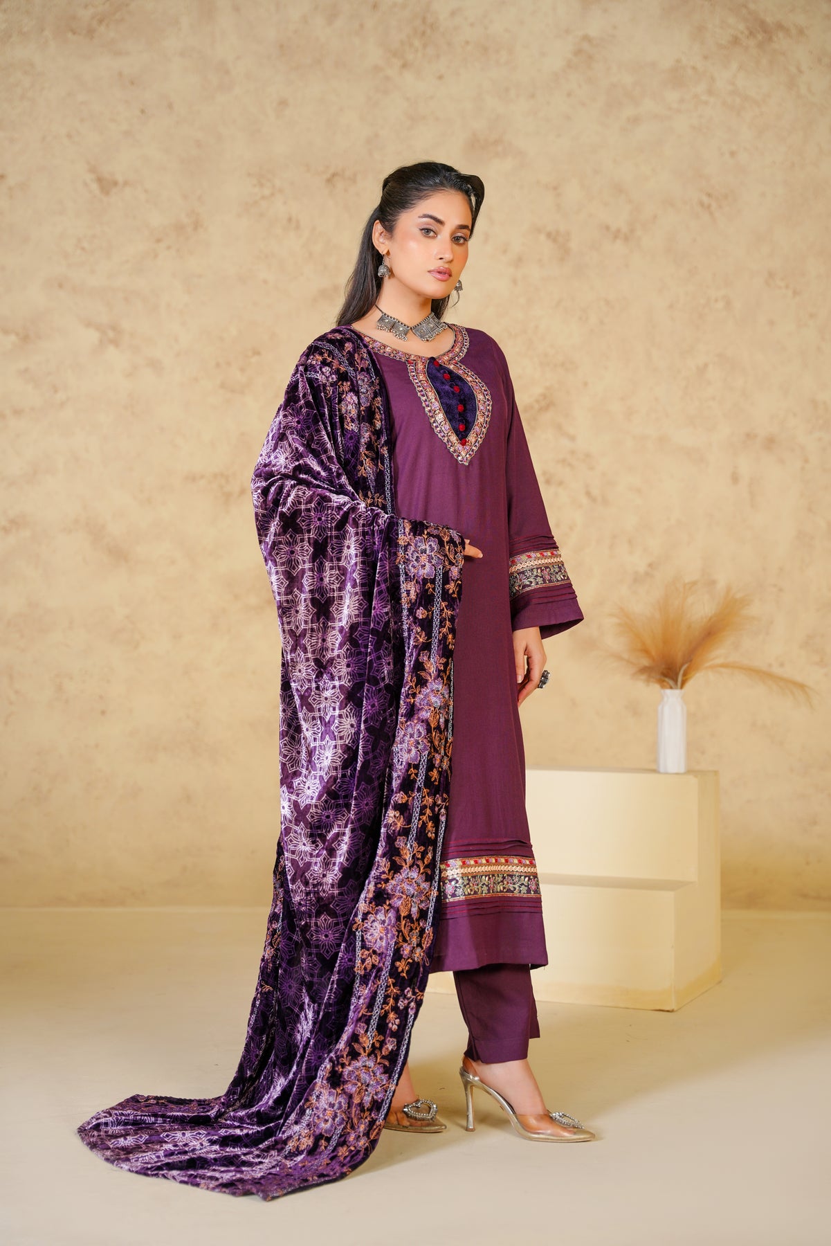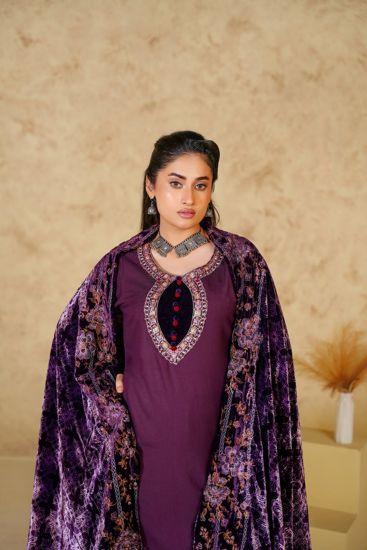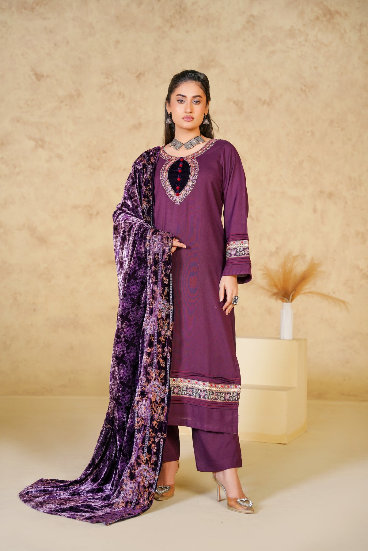 Make a bold yet graceful statement with the Royal Amethyst Dhanak suit, beautifully crafted in a deep brown shade. The elegant floral embroidery enhances the richness of the outfit, while the dhanak fabric ensures warmth and comfort throughout the winter season. Perfect for festive gatherings, evening meet-ups, and winter celebrations, this suit blends traditional charm with modern refinement.