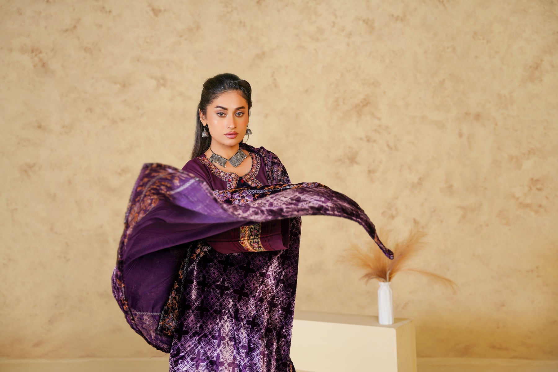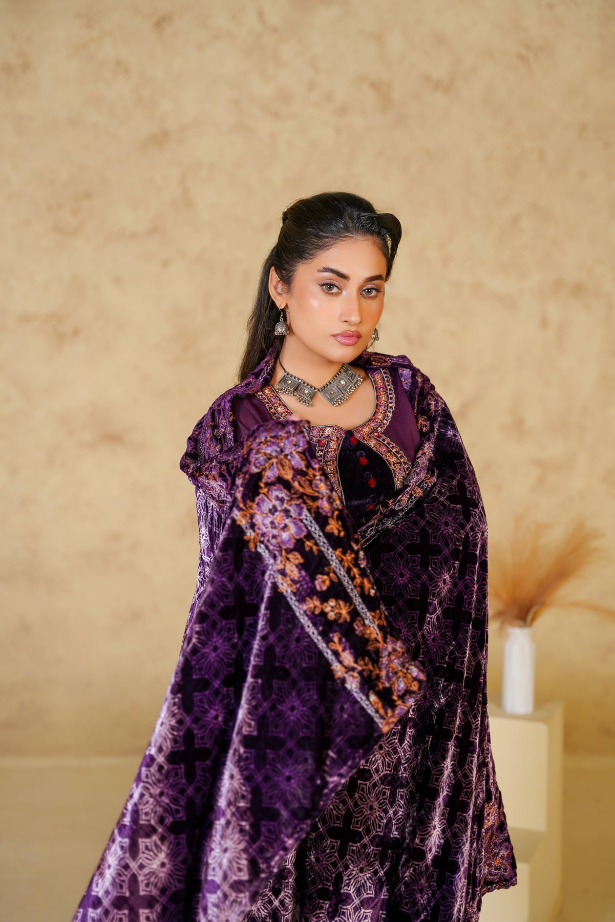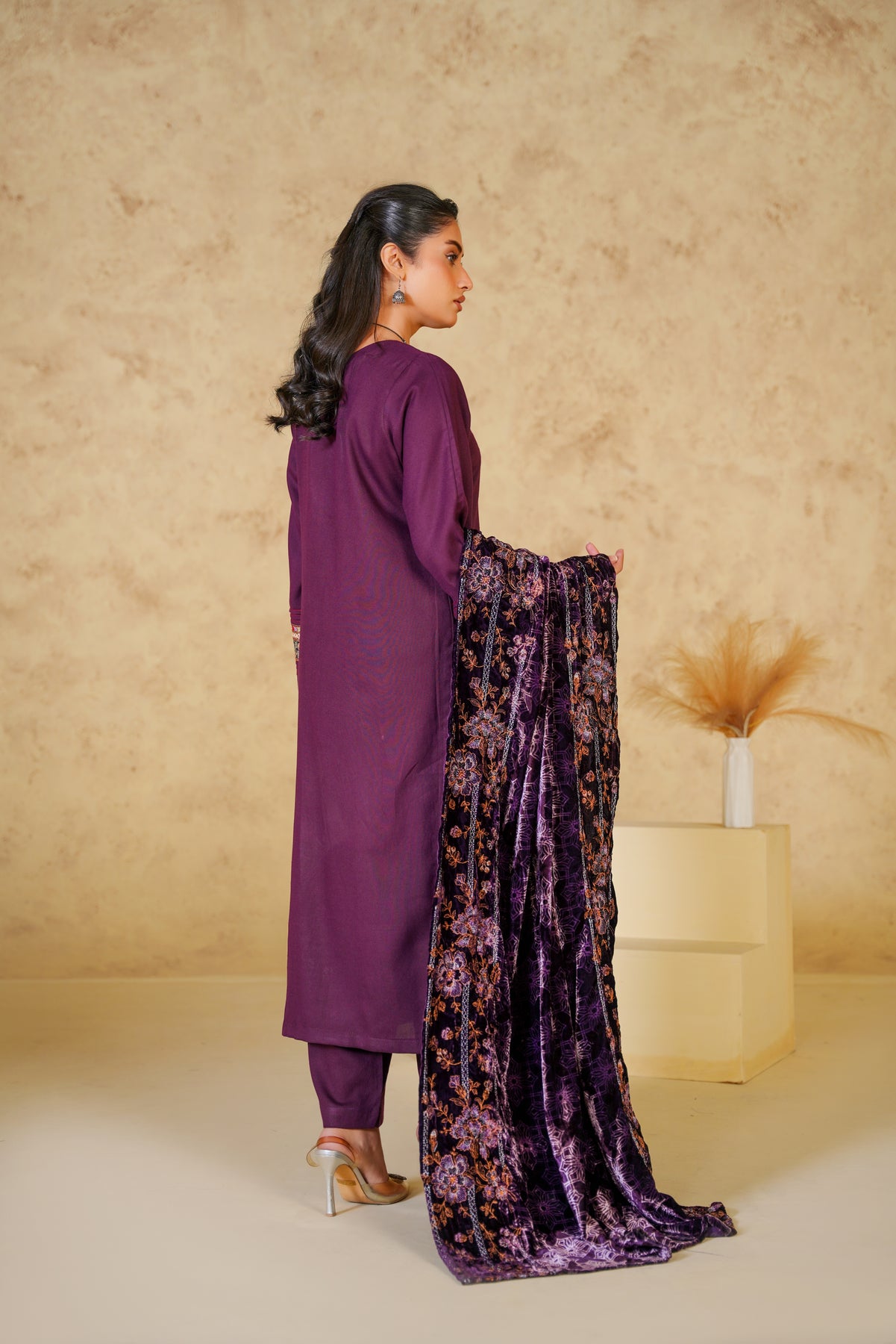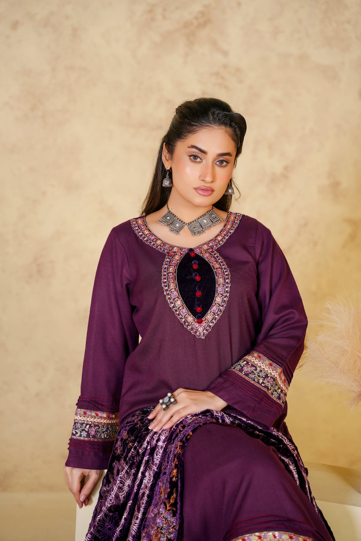 Make a bold yet graceful statement with the Royal Amethyst Dhanak suit, beautifully crafted in a deep brown shade. The elegant floral embroidery enhances the richness of the outfit, while the dhanak fabric ensures warmth and comfort throughout the winter season. Perfect for festive gatherings, evening meet-ups, and winter celebrations, this suit blends traditional charm with modern refinement.