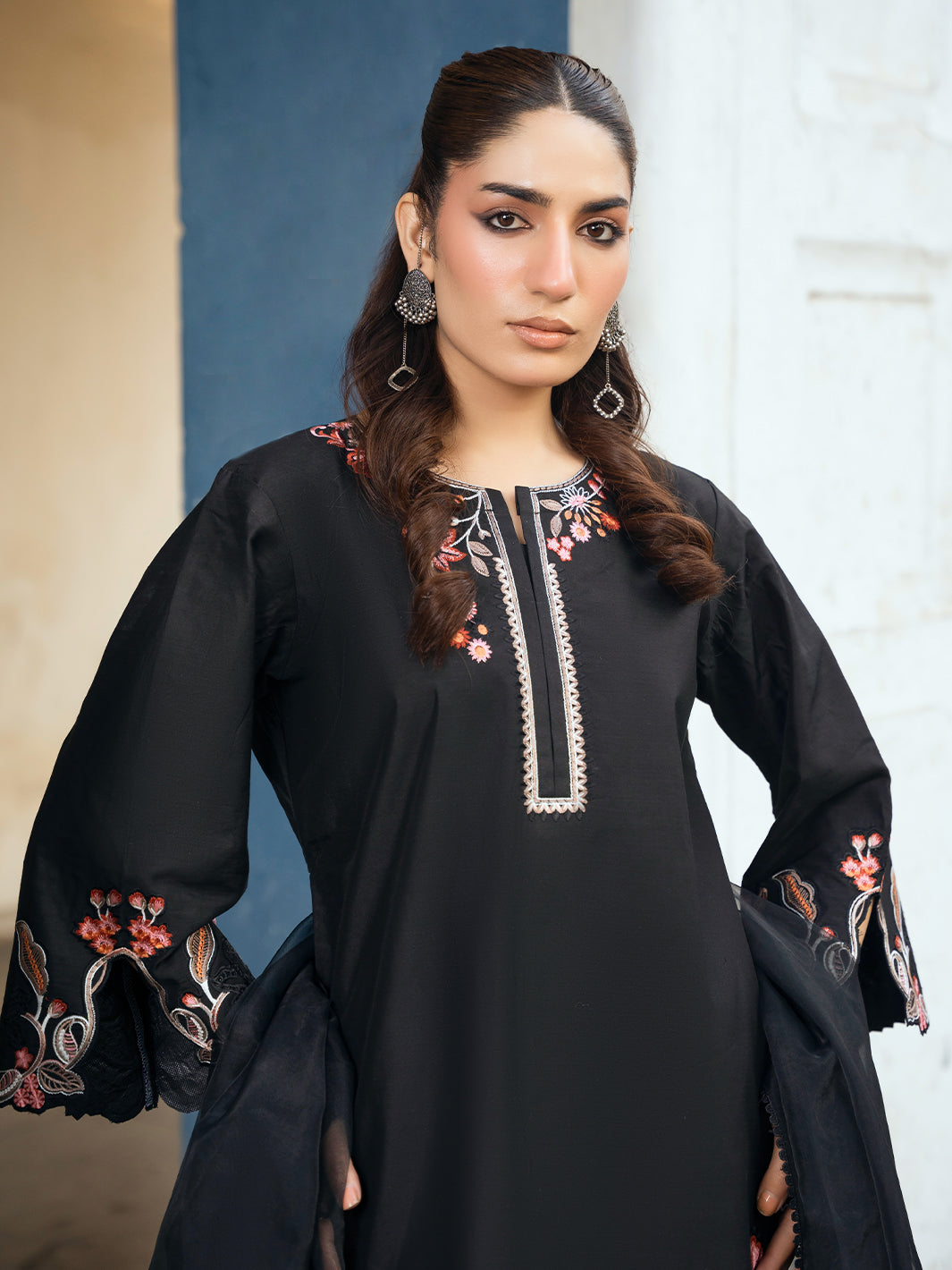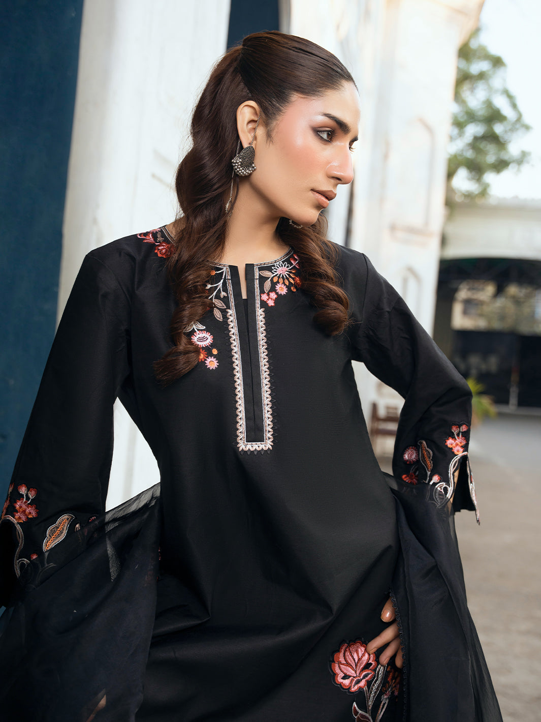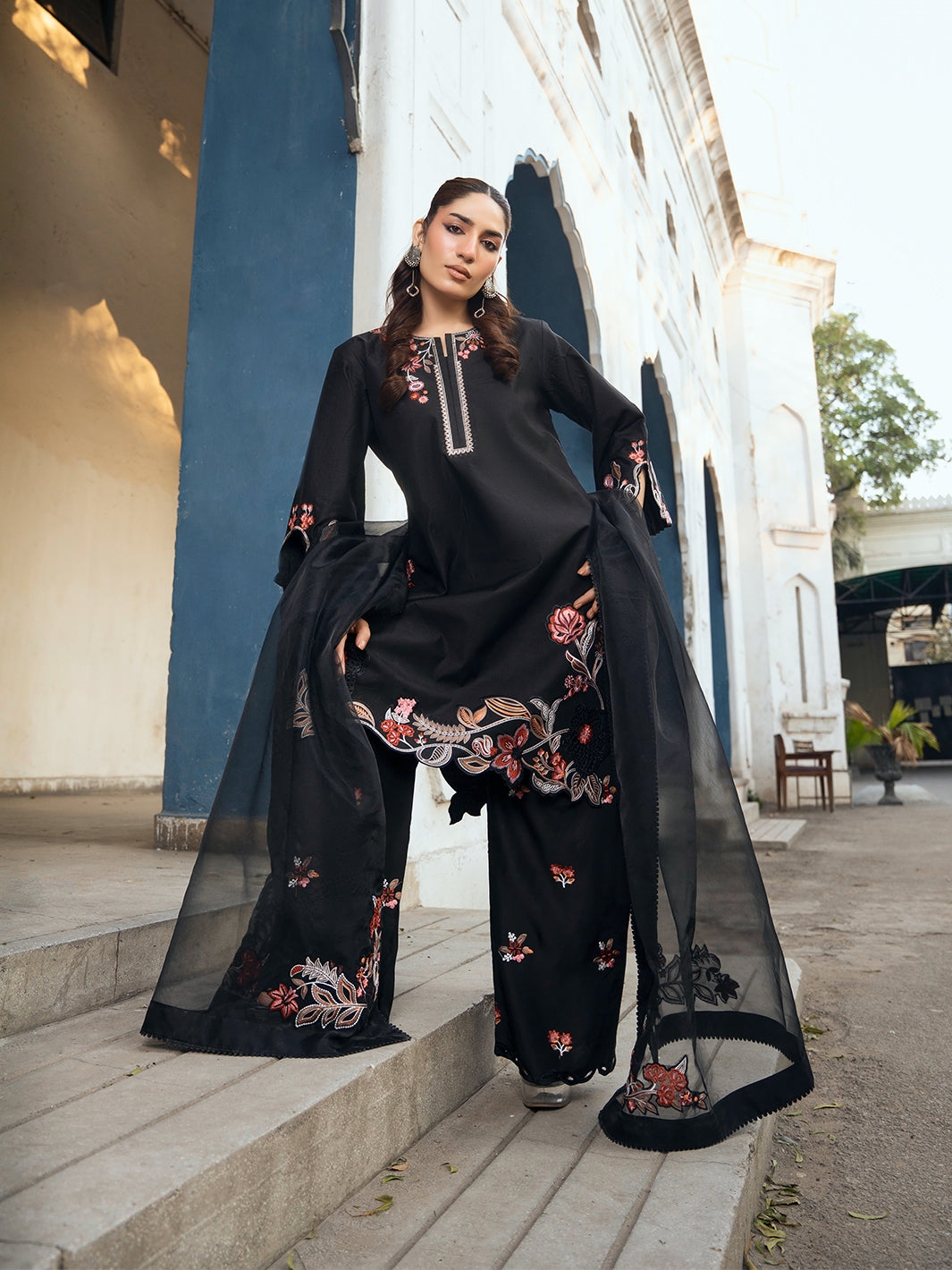 Statement black formal featuring multi-head embroidery on shirt and trouser. Mirror embellishments on neckline paired with chiffon dupatta and farshi shalwar.
