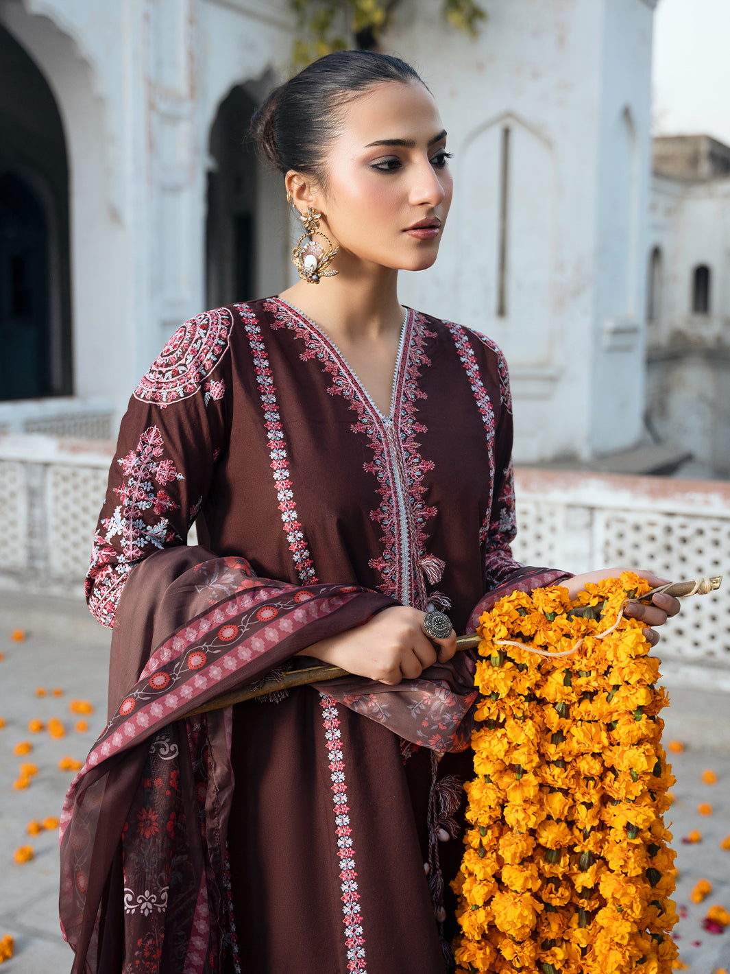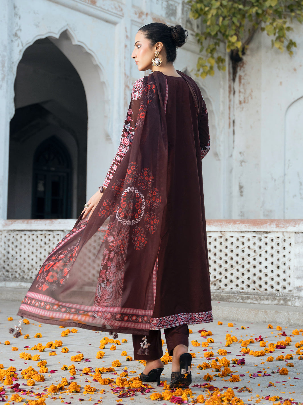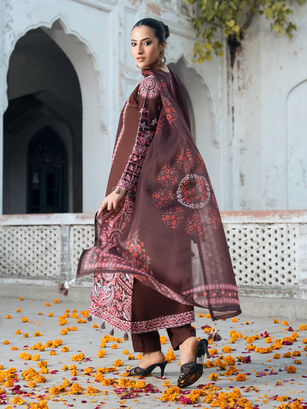 Classic brown outfit with detailed multi-head embroidery and lace finishing. Includes tassel detailing with flared palazzo and sublimation printed voile dupatta for a graceful look.